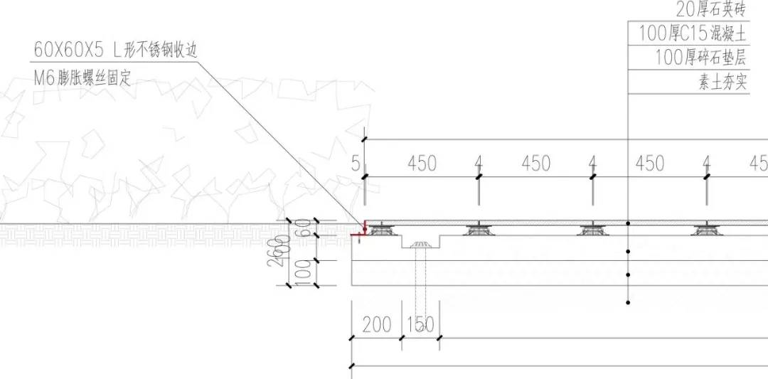■ 地面鋪裝側(cè)面收口:平面鋪裝采用不銹鋼收口及干凈,可遮擋石英磚側(cè)面高度。且不銹鋼全部拆卸及二次重組。