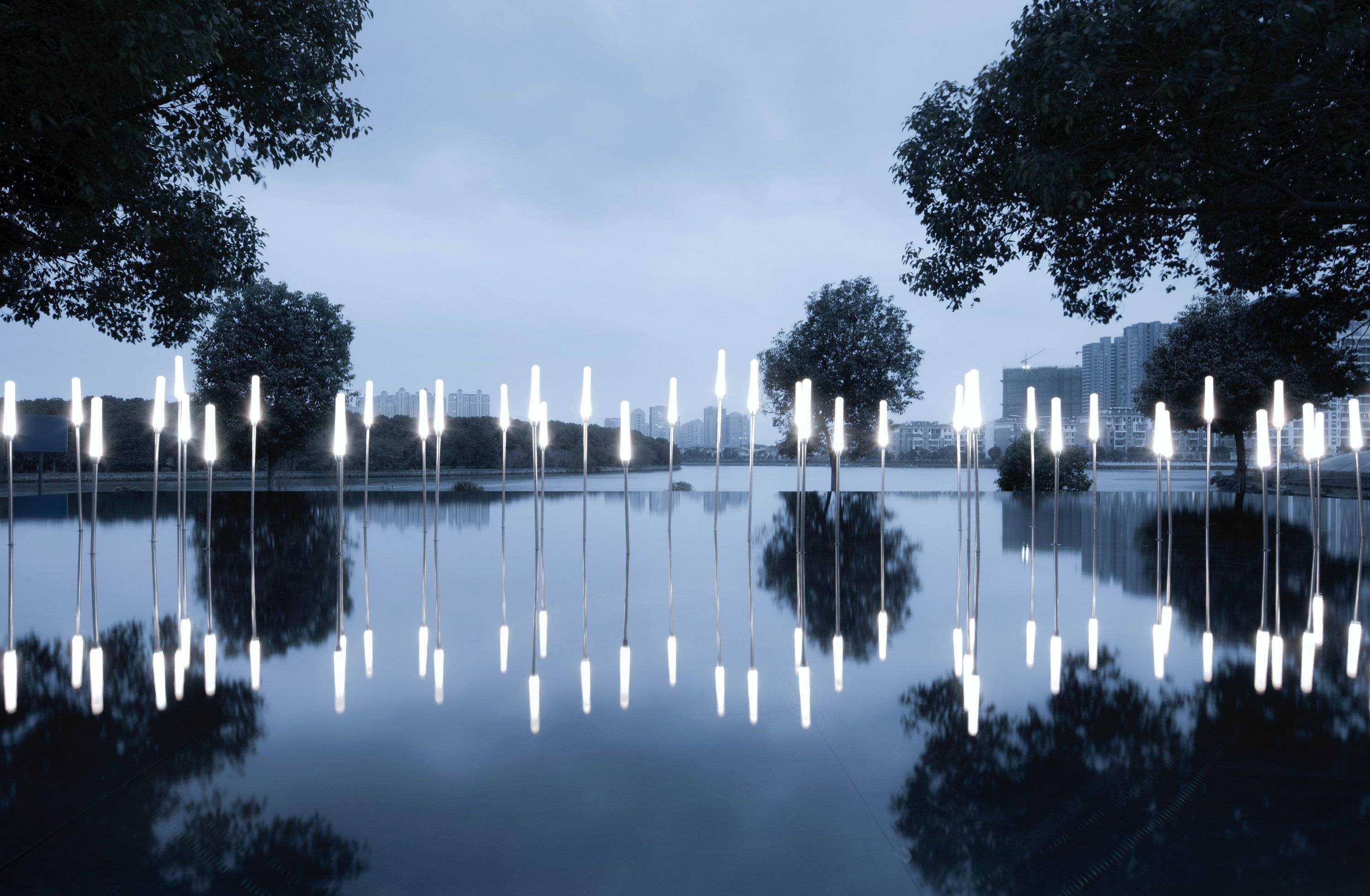 在視覺盡頭設(shè)置與外部河面平行的水景臺,連接內(nèi)與外的景觀,真正達(dá)到無邊的連接。考慮到外部河道經(jīng)常有貨船停泊,在水景臺上布置一排錯落的蘆葦燈進(jìn)行適當(dāng)遮擋。在近距觀賞的同時,蘆葦燈也點(diǎn)綴了場景,使景色不會過于直白,充滿趣味。