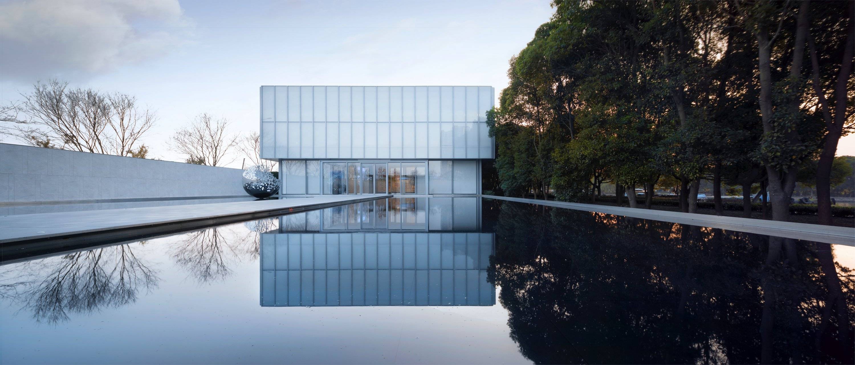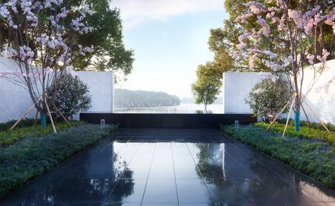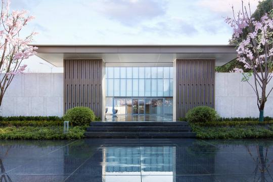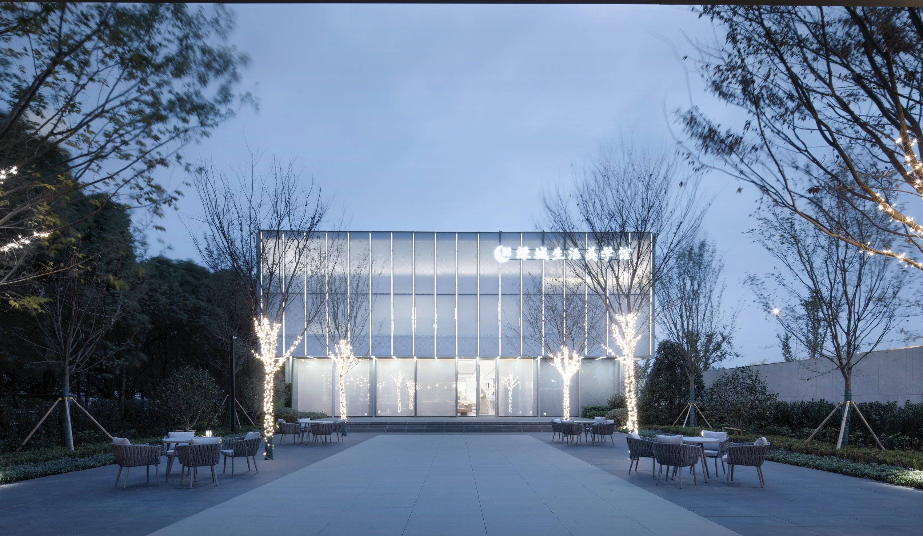 將周圍的自然景色融入池水之中,營造出抽象的美學(xué)意境,建筑白色的軀體游走在水天之際,映帶著湖光、候鳥、古木、青云。建筑的半透明玻璃表皮將南側(cè)的蔥郁的樟樹林映入,使建筑顯得透明輕盈,并減弱了建筑形態(tài)和自然景觀的沖突,調(diào)和了二者的色調(diào)與觸感。鏡面水景中將綠城標(biāo)志性的月亮桂花元素重新設(shè)計(jì)形成一輪彎月,漂浮在水院之上,與項(xiàng)目案名“明月蘭庭”遙相呼應(yīng)。