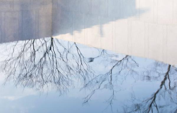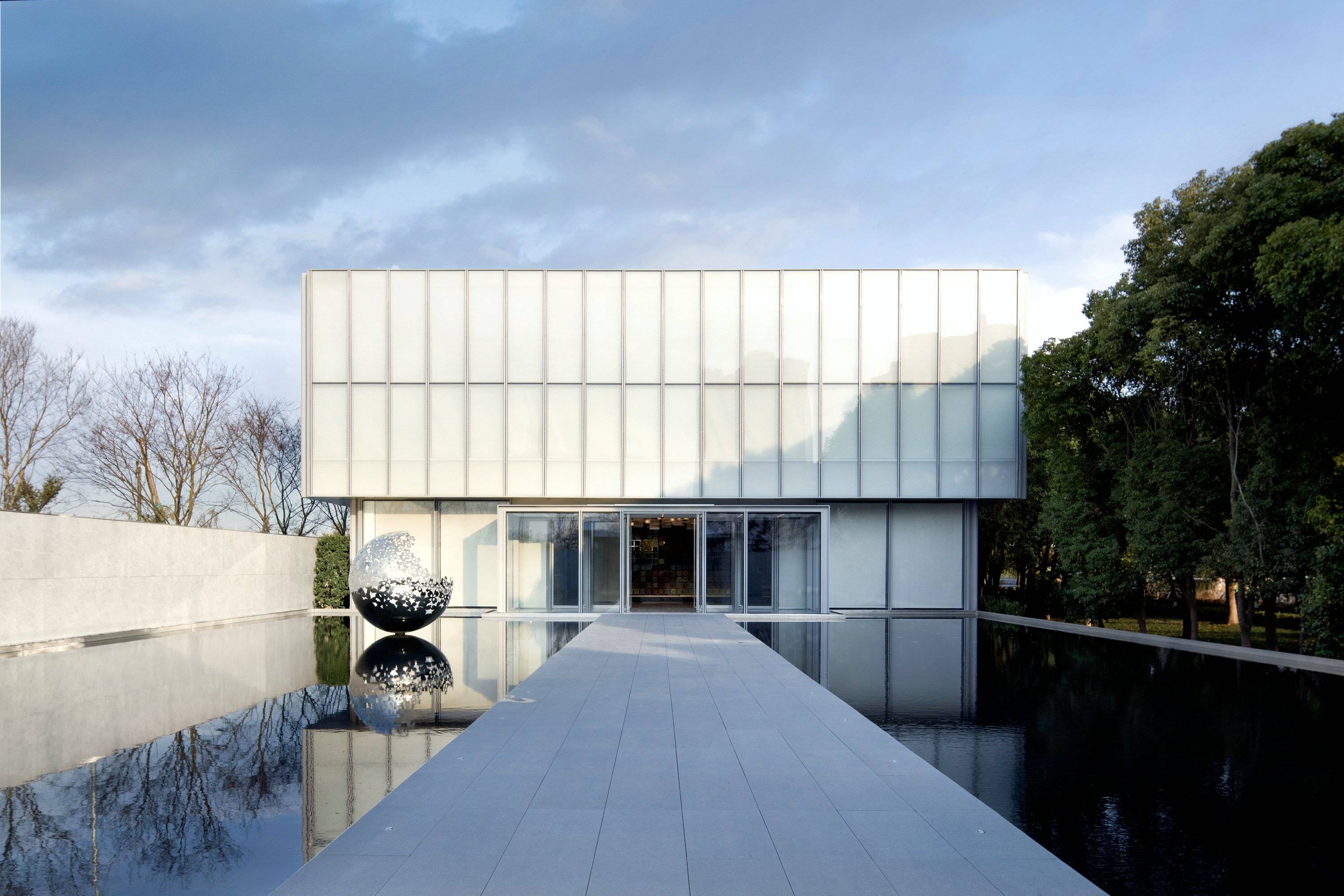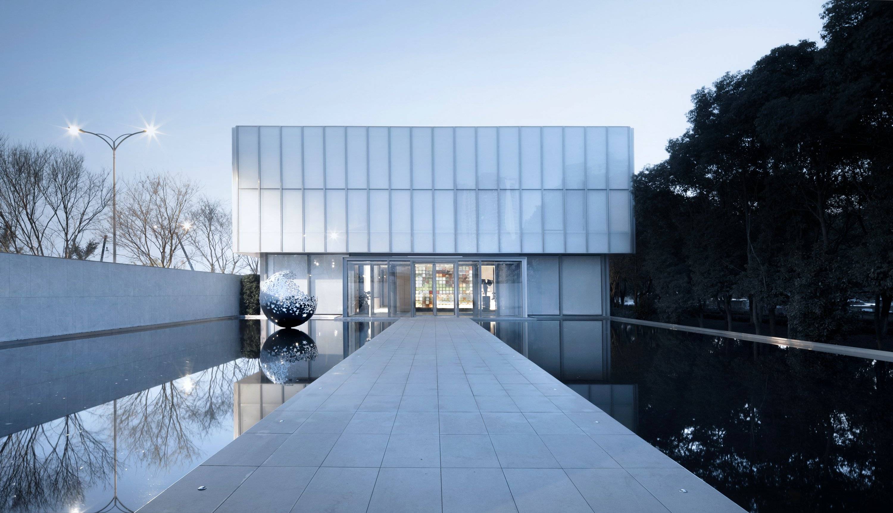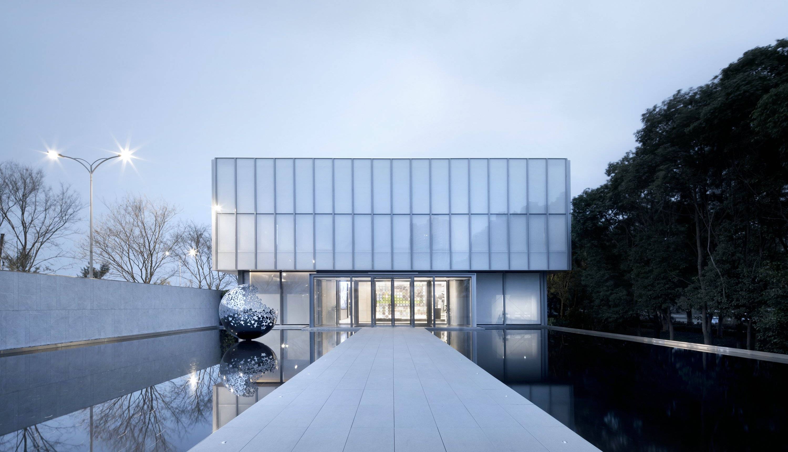 將周圍的自然景色融入池水之中,營造出抽象的美學(xué)意境,建筑白色的軀體游走在水天之際,映帶著湖光、候鳥、古木、青云。建筑的半透明玻璃表皮將南側(cè)的蔥郁的樟樹林映入,使建筑顯得透明輕盈,并減弱了建筑形態(tài)和自然景觀的沖突,調(diào)和了二者的色調(diào)與觸感。鏡面水景中將綠城標(biāo)志性的月亮桂花元素重新設(shè)計(jì)形成一輪彎月,漂浮在水院之上,與項(xiàng)目案名“明月蘭庭”遙相呼應(yīng)。