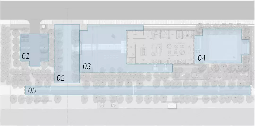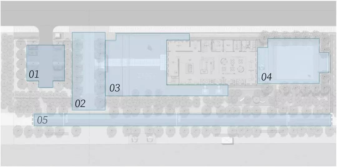 01 停車落客空間 02入口觀景迎賓道 03 前場水景區(qū) 04 后場洽談空間 05沿河林蔭步道