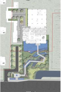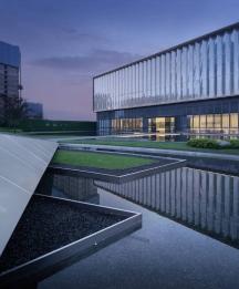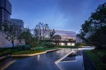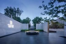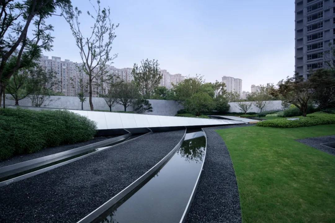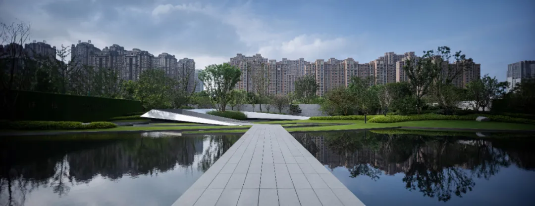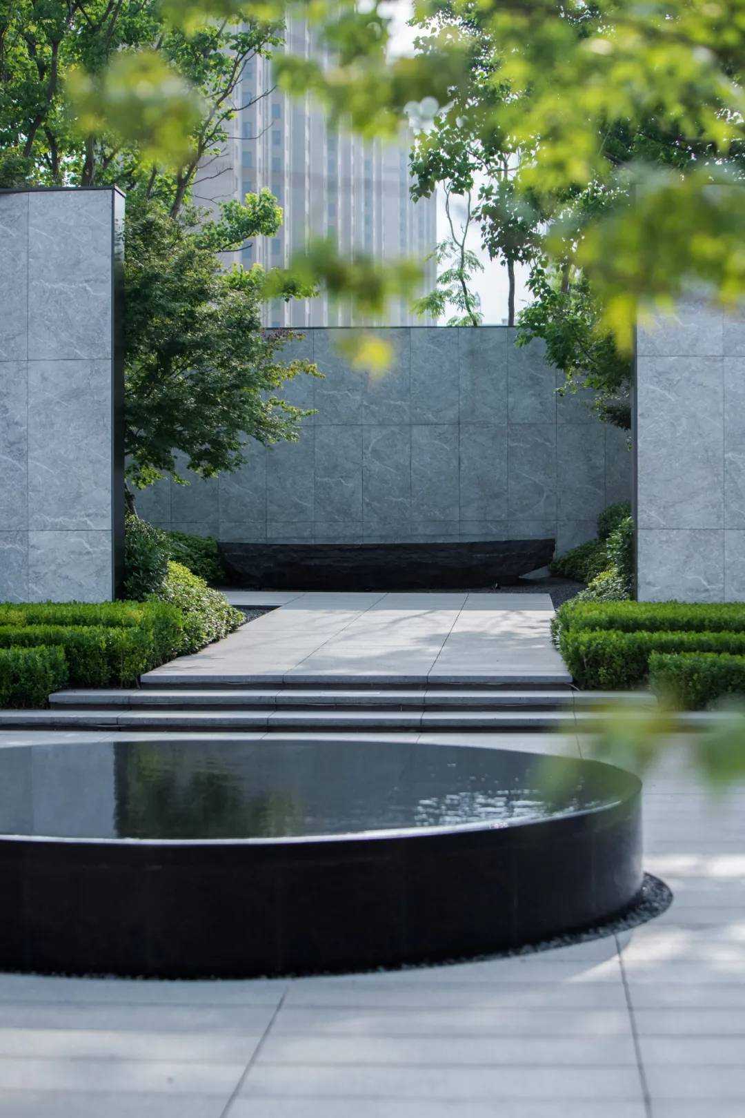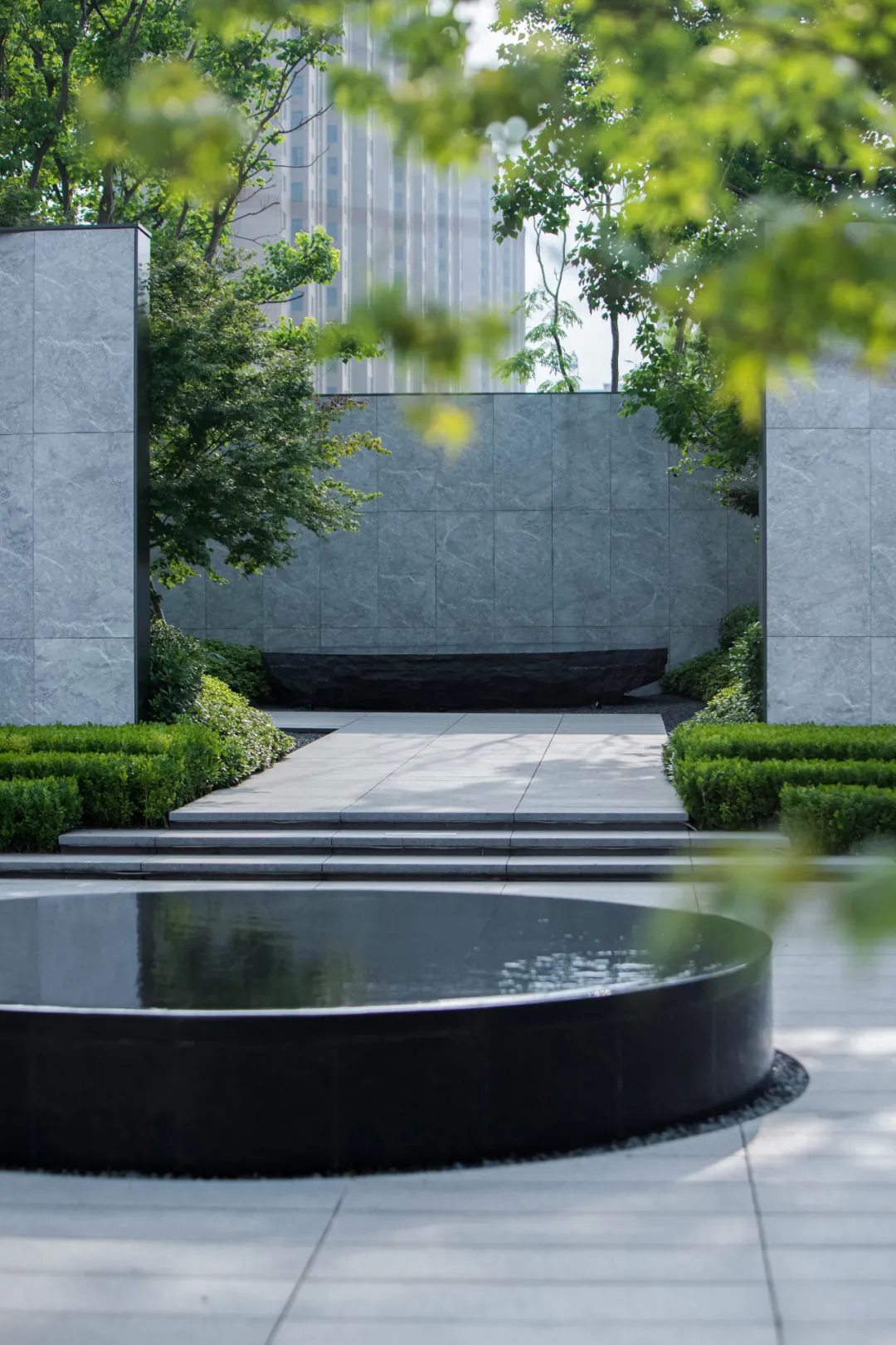 統(tǒng)一簡約的景墻延續(xù)至場地內部,入口自然而然的形成禮儀尊貴的迎賓院落。設計為滿足藝術與功能的需求,設置了一個圓形的境水面置于空間中間,從而組織出清晰的市政步行、車行落客的到達人群和回返人群的交通導向。