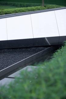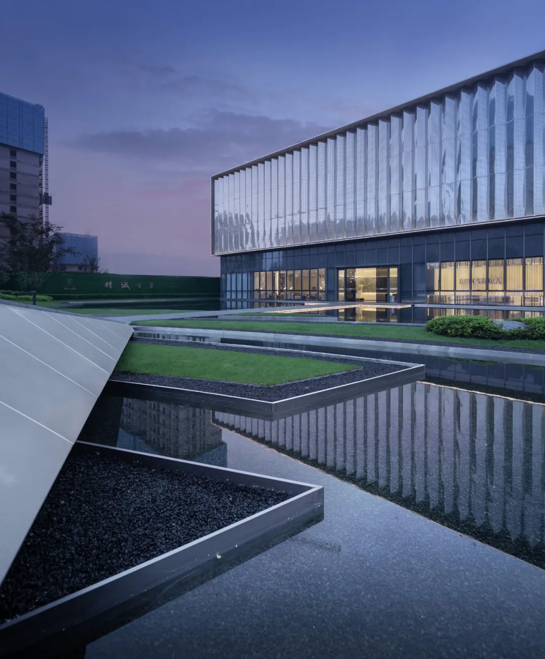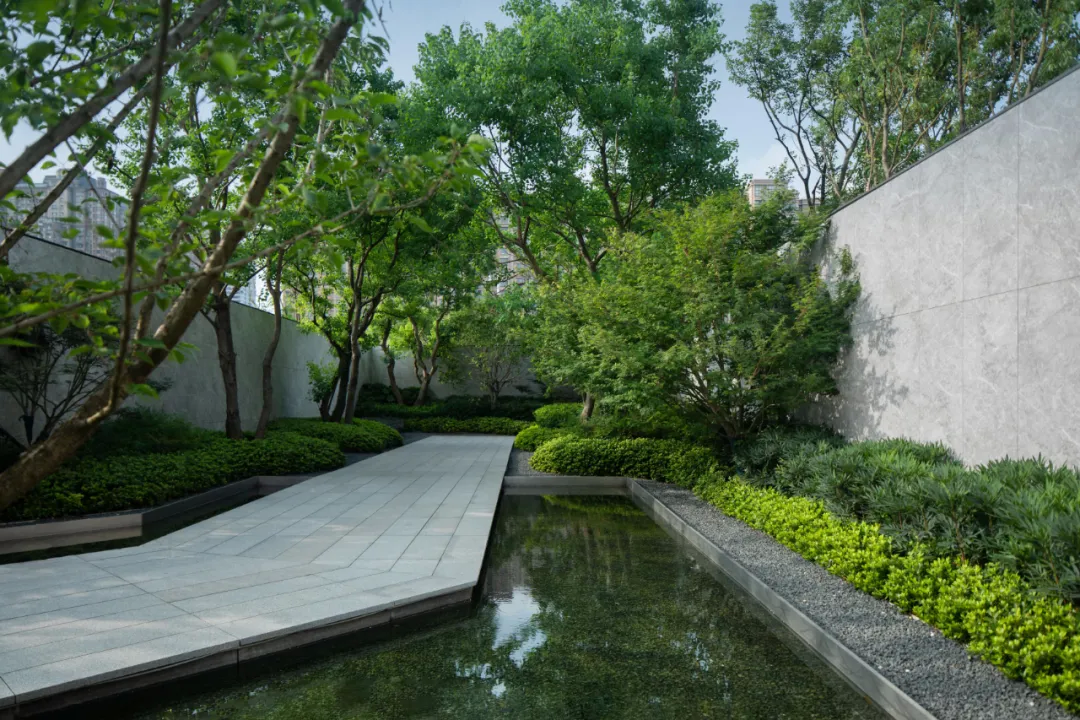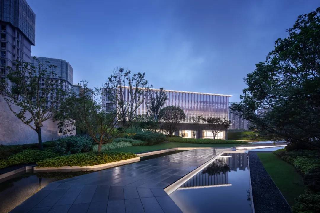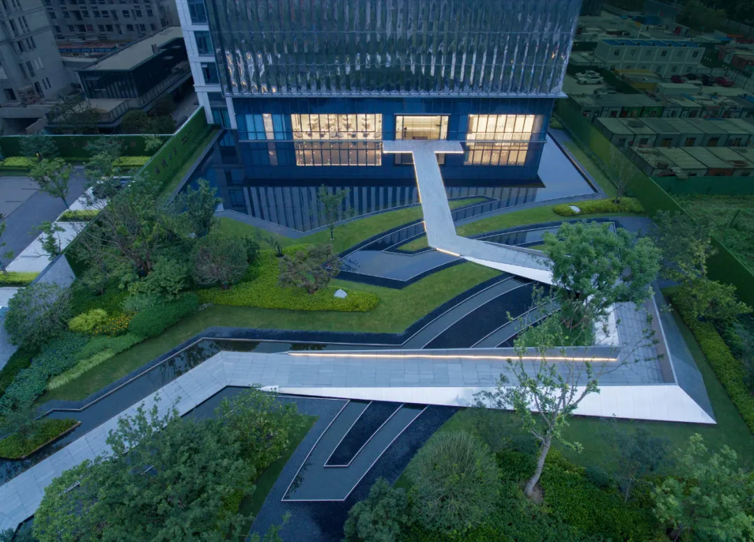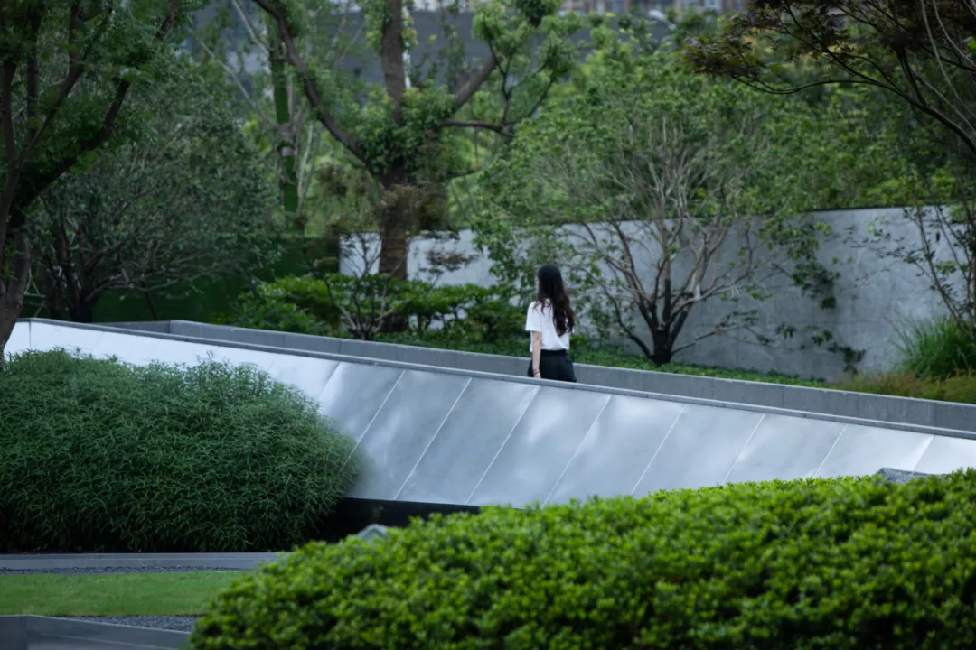景觀強調建筑與環(huán)境的融合,16米高的主體建筑體量,在3.6米的景墻與挺拔的植物映襯下,二層建筑如同漂浮的盒子懸于景觀之上。