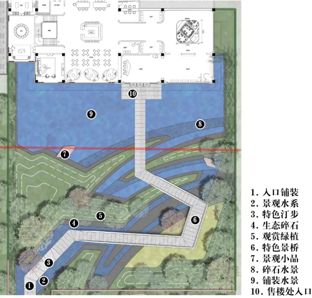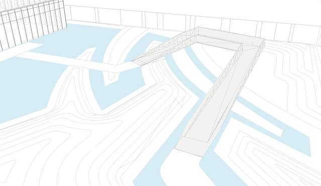結合大尺度的水院運用,原創(chuàng)設計出水上汀步的鏡橋構筑物,形成空間場所自然的行為導向,同時明確了建筑與周圍環(huán)境的響應關系。鏡橋主體凌空架設,是場地整體構型的重心,橋下通過模擬河湖交匯、橋路皆宜的關系,將鏡橋與水渠相互穿流、折角開合,水底通過不同材質變化呈現(xiàn)出暈染的效果,植物與碎石象征退潮后的濕地。