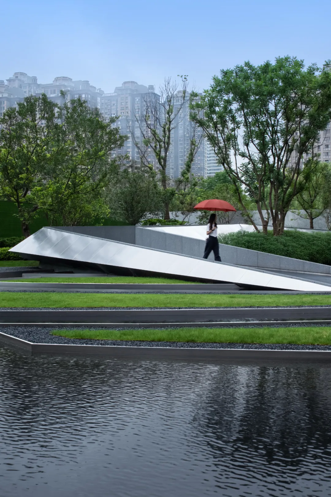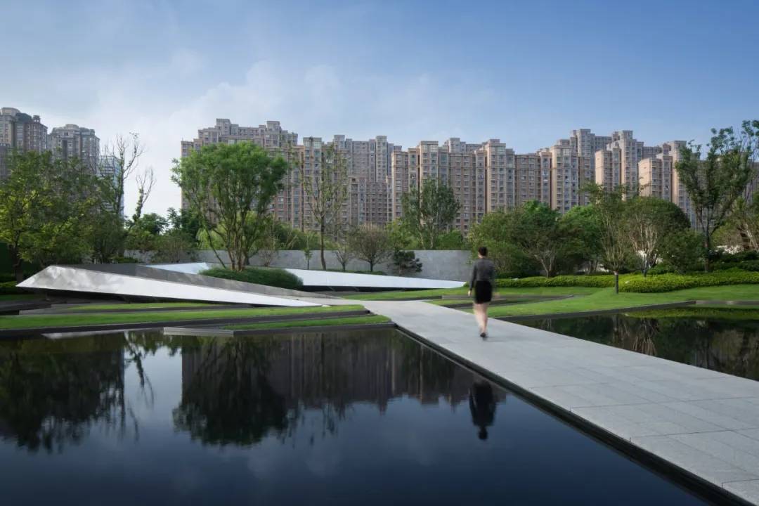 景觀設計以南通清澈遼闊的水域特色為基底,提煉其中灘涂、廊橋、小舟元素,通過現(xiàn)代化的設計語言,主動在平地上創(chuàng)造了懸浮的鏡橋,呼應南通重要元素“橋”,以及“潮汐”留下的線條痕跡,共同構成一個“海天一色,天空之鏡”的景象。