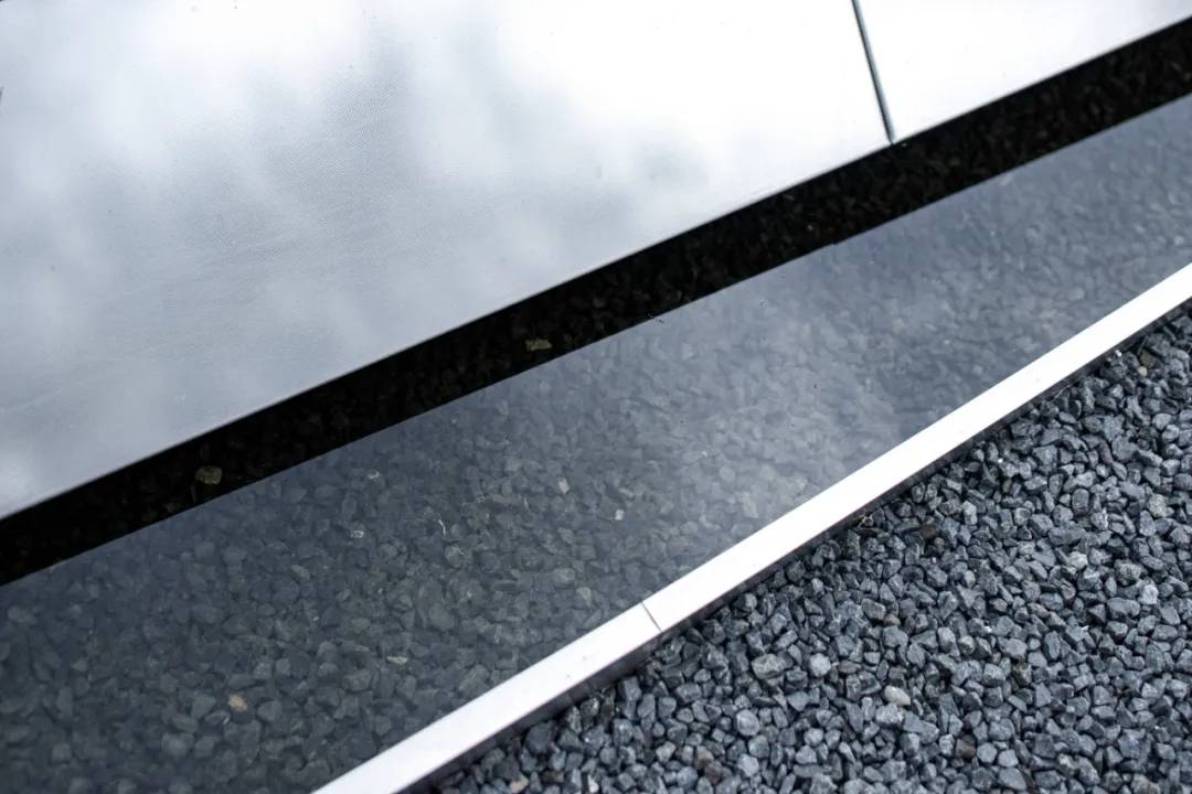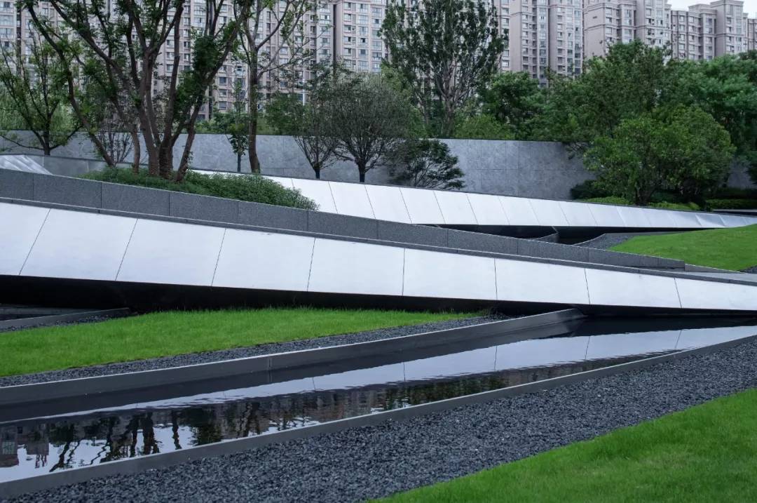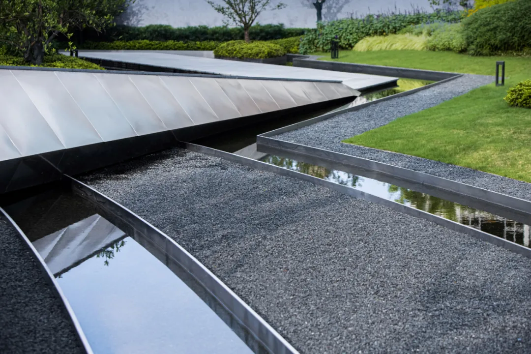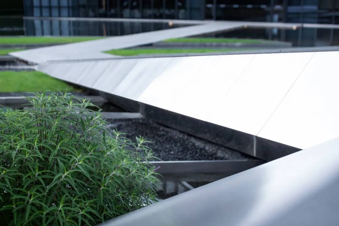 鏡橋選用‘米粒面不銹鋼與石材’相結合的手法作為主要材質,可以在提供實現(xiàn)靈活的大跨度空間的同時,避免了常規(guī)承重墻柱對臨水環(huán)境中視線的分隔和遮擋。同時,還杜絕了‘傳統(tǒng)鏡面不銹鋼’產(chǎn)生的光污染和高溫問題,存留下更加溫柔舒緩的折光效果,可與水中的倒影,一同為行徑者,演繹出一種動態(tài)變化的自然體驗。