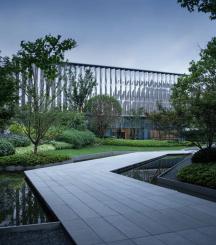 項目位于江蘇省南通市崇川區(qū)洪江路與通富北路交匯處。設計以“水”為媒介串聯(lián)起了三進空間的格局:入口迎賓,林蔭禮序和灘涂水院,它們一同構成了場地與建筑之間的景觀節(jié)點,公共視廊的開放空間和“游園于水上”的情景敘事。
