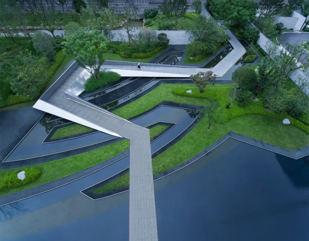 從灘涂中尋找靈感的三進灘涂水院,既還原了灘涂處于海岸過渡地帶的景象,又消弭出陸域和水域的清晰分界。ZSD 通過抽象化的手法提取灘涂上縱橫交錯、深淺不一的溝坎線條,設計出一系列貫穿全場地,并與建筑設計相呼應的“幾何折線”路徑和“立體褶皺”界面。