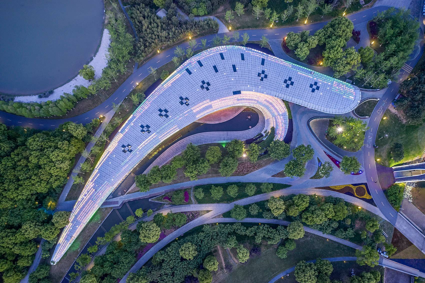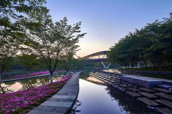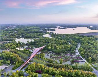 The Chinese character ‘Lan’ in ‘Lanxi city’ means orchid. It acts as a mental symbol of grace and elegant. Shaped like an orchid leaf and laid above the creek, this pedestrian bridge is the first thing will be seen in launch area. The shape, color, material and scale of the landscape bridge can fully blend into the surrounding environment and is a highlight that adorns the nature surrounding. It also provides shade, rest, and a view, also allowing pedestrians and bicycles to pass through the area directly.