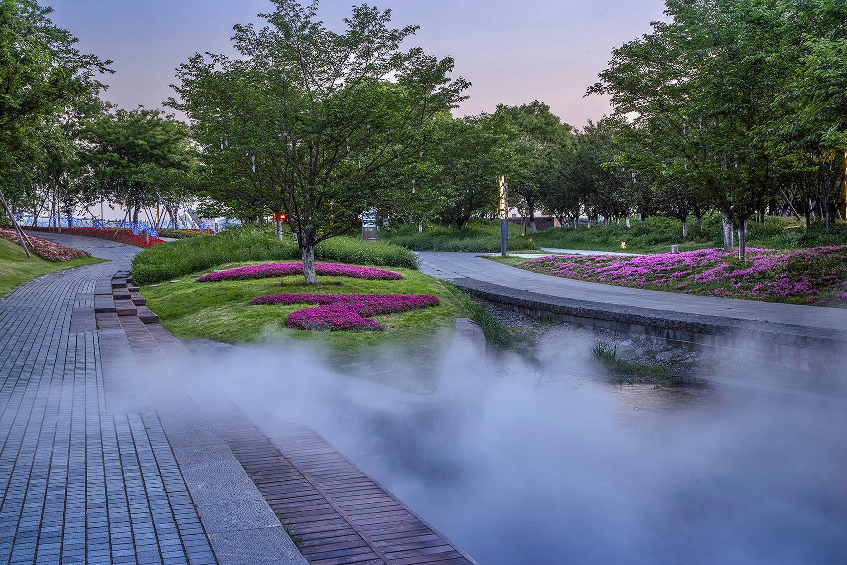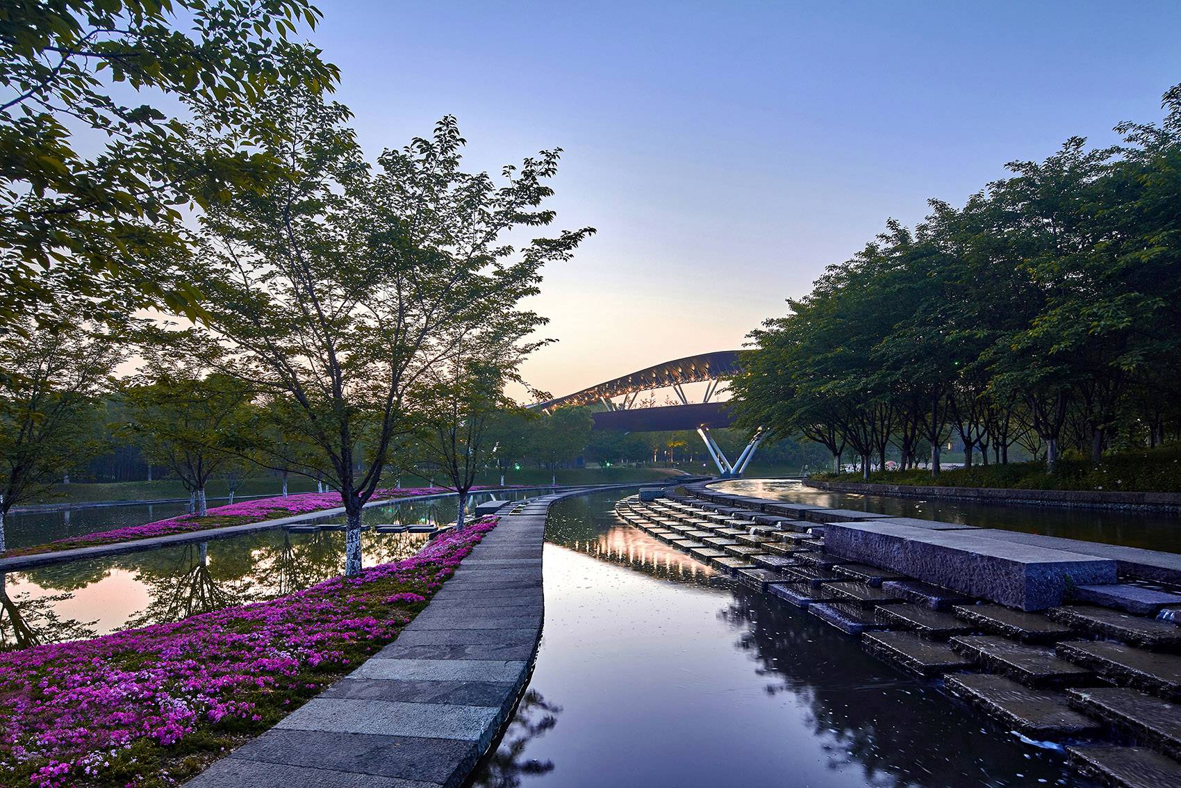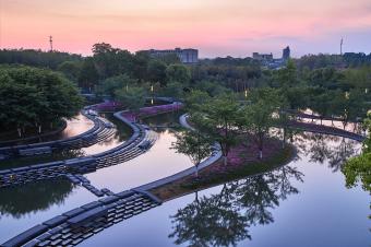設計結合自然肌理,在花溪中穿插縱橫交錯的石質跌水臺階步道,游客可以嬉戲其中,充分親近場地水體。