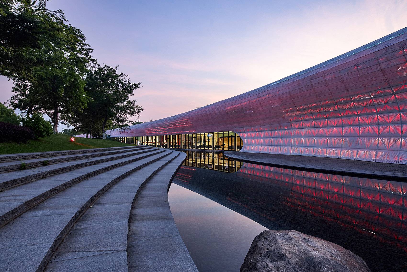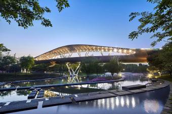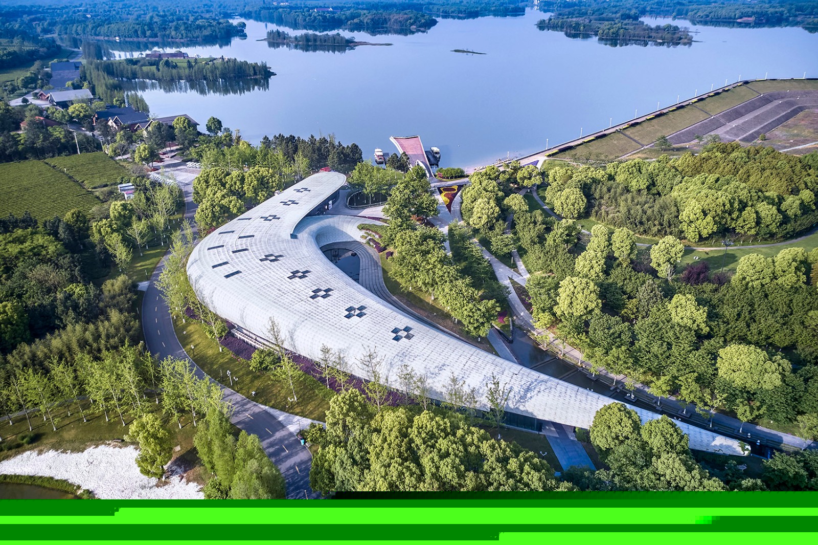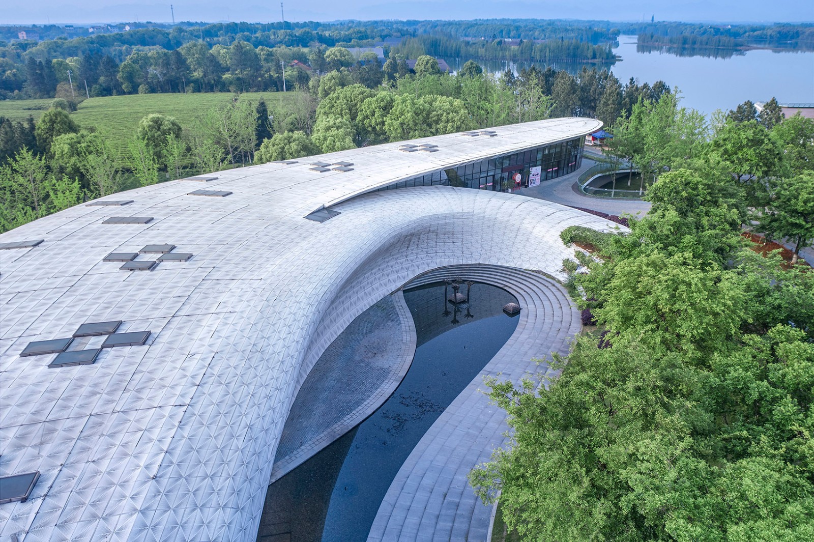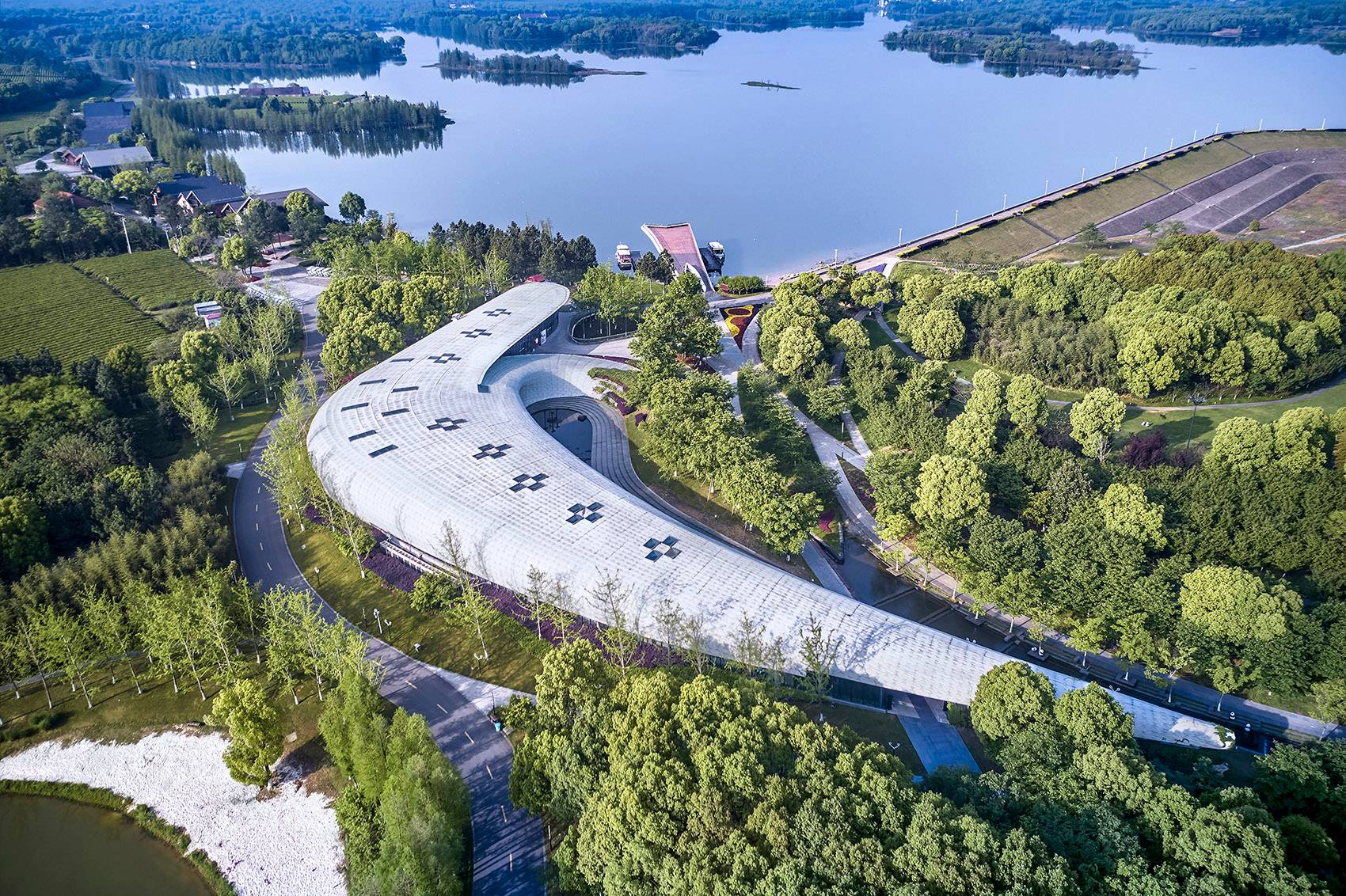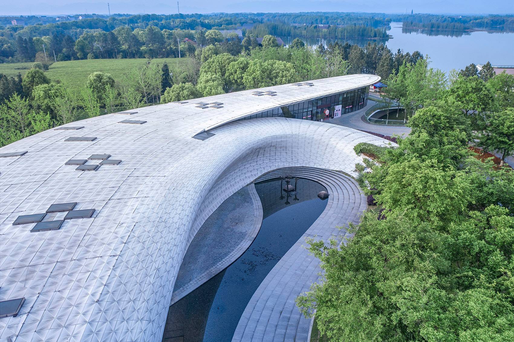 The site of the visitor center was a duck farm on the top hill. The current hill is devoid of vegetation, and the top of the hill has been leveled. The concept of the architecture design is that the visitor center is built with terrain on high ground with natural continuous shape to reveal the original landform of the hill. The building is as calm and soft as jade, with no sharp angles, lying on the ground, extending into the soil. Leave the skyline for treetops and save the crest for the lake.