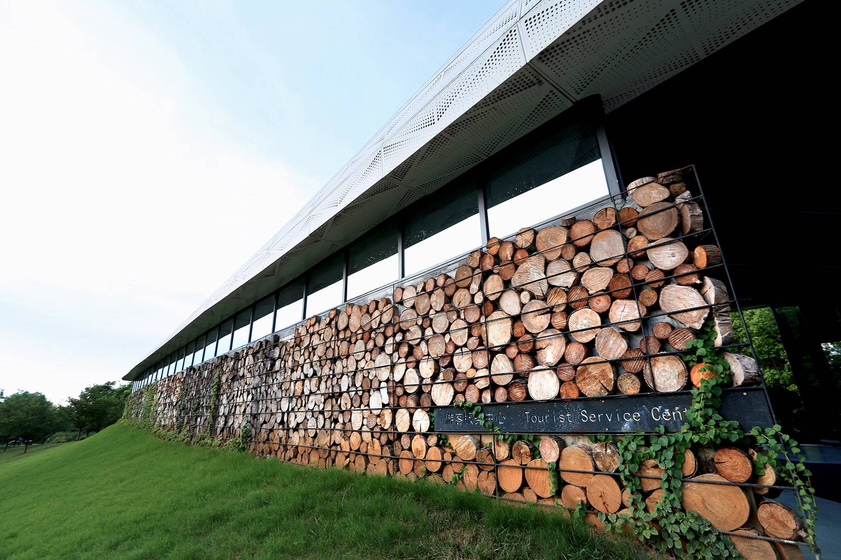 啟動區(qū)施工過程中,有部分喬木沒有種植成活。設計師挑選其中形態(tài)良好,根系完整的部分,將其加工后置于游客中心周邊,替代部分高耗能的雕塑。將部分樹干切片并做防腐處理后,用于建筑立面,節(jié)省了大量飾面耗材。