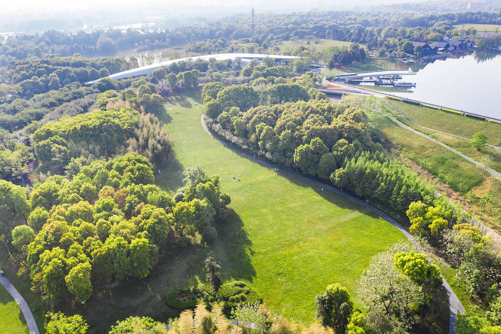 基地現(xiàn)狀有大片苗圃,種植的苗木被銷售后留下了大面積裸露的空地,導致水土流失和嚴重的揚塵。設計通過地形處理將裸露的空地連成一片后種植成草坪。再通過喬木、灌木種植修整邊界輪廓,最終形成植被疏密有致、空間縮放變化的大草坪。改建后的大草坪吸引了許多游客來搭帳篷、野餐、放風箏,還是度假區(qū)舉辦草地音樂節(jié)的理想場所。
