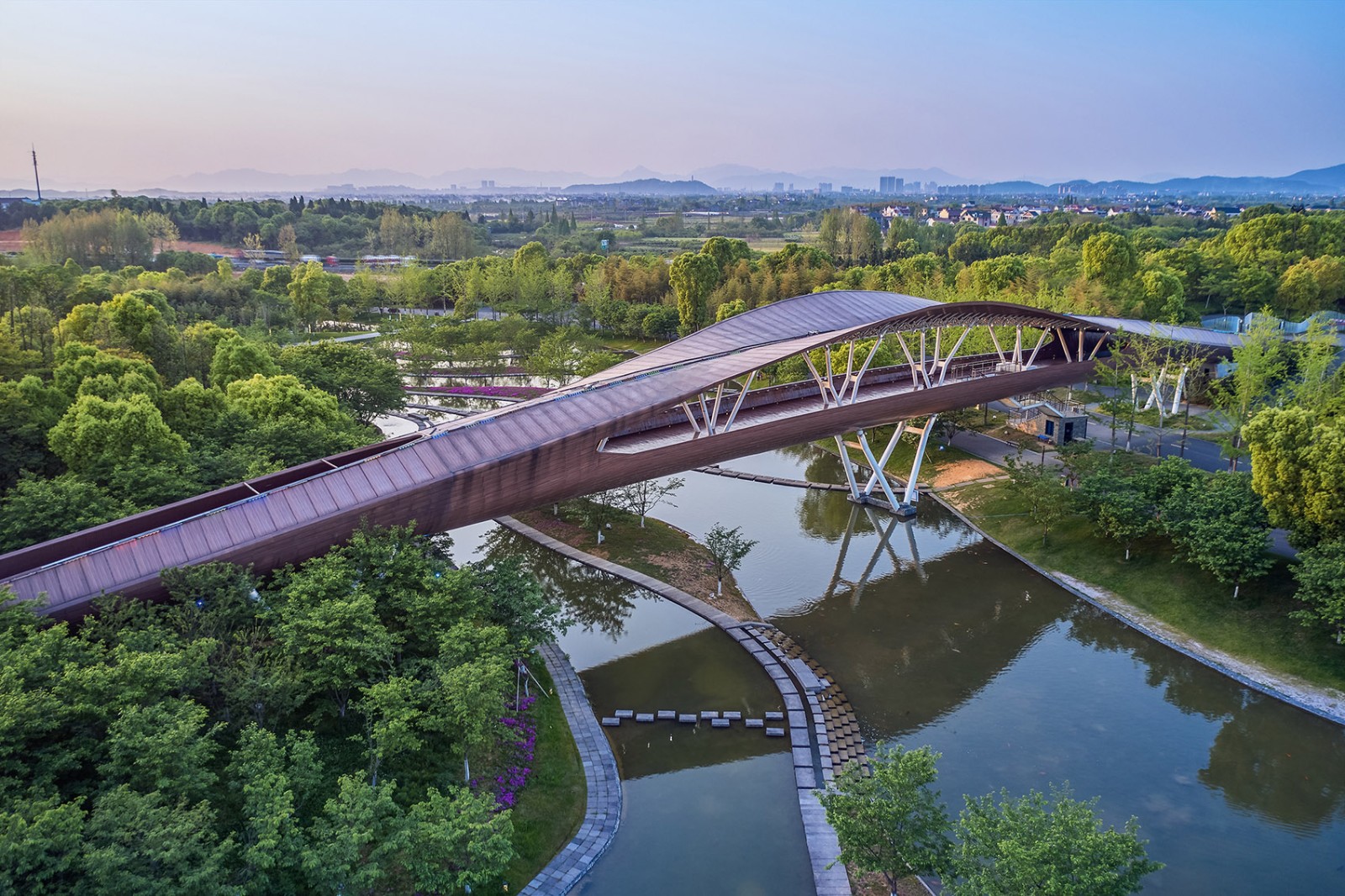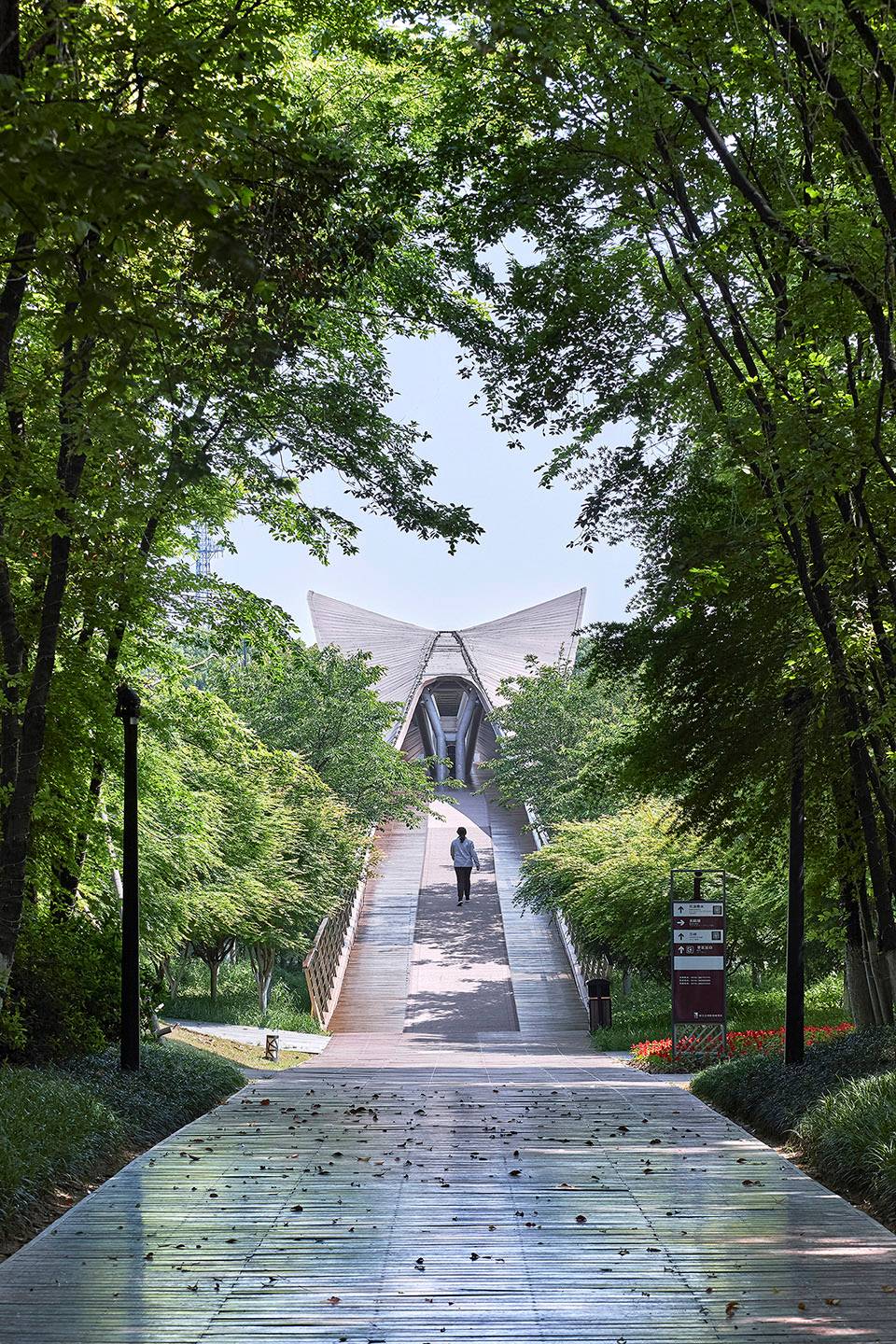 蘭溪市的蘭,是蘭花的意思。進入景區(qū)最先看到的,就是這座形似蘭葉的步行橋。景觀橋的造型、顏色、材質和尺度都能充分融入周邊環(huán)境,是點綴在自然中的高光。同時具有遮蔭、休憩、觀景功能,也可供行人和自行車快速通過景區(qū)。