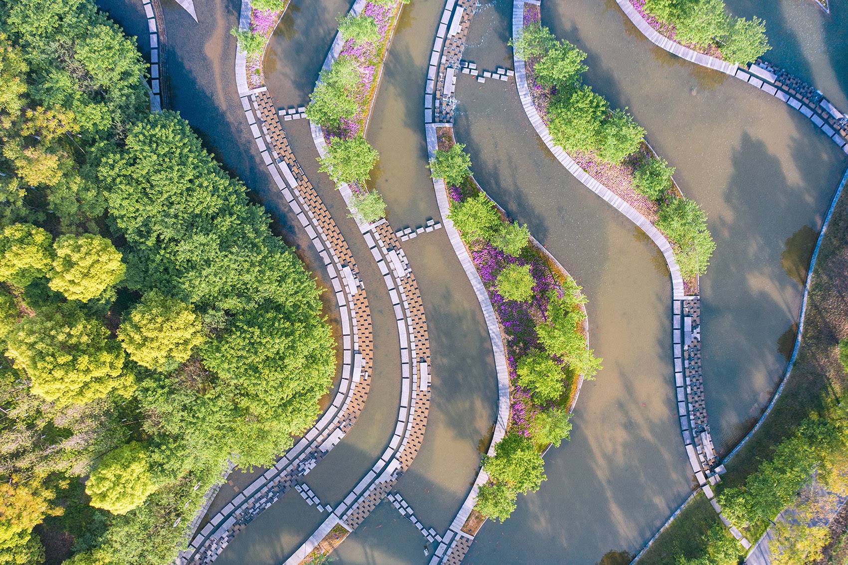 The design respects and utilizes the original site topography and creates a multi-stage water terrace. The water originally used for irrigation is introduced into the landscape, allowing the irrigation water to flow through the Floral Creek before continuing to irrigate. Without affecting the agricultural irrigation, the Floral Creek, a living waterscape, realizes self-motion flowing with gravity, and achieves zero energy consumption.