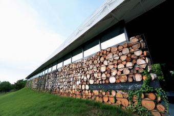 During the construction of the launch area, some of the planted trees did not survive. The designers selected those with good form and intact roots, processed and placed them around the visitor center, replacing some of the energy-intensive sculptures. Sections of the trunk were sliced and preserved for use on the building fa?ade, saving a lot of finishing supplies.