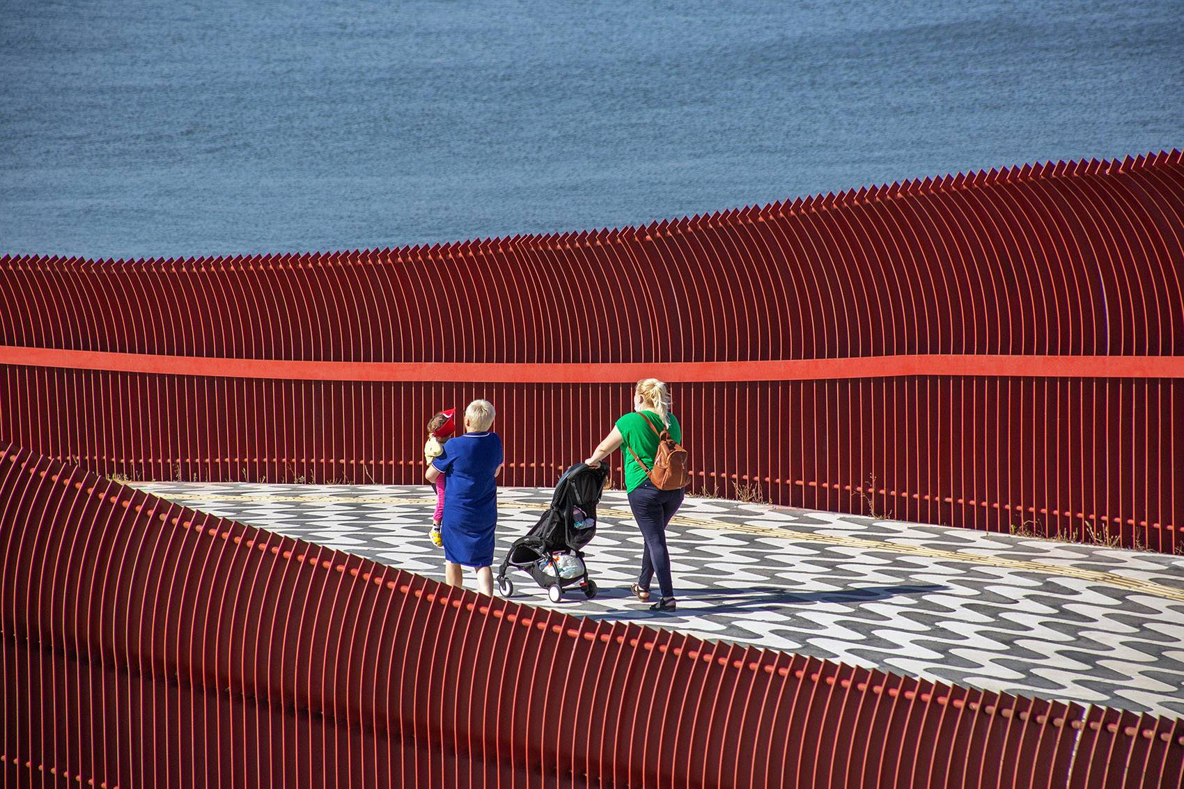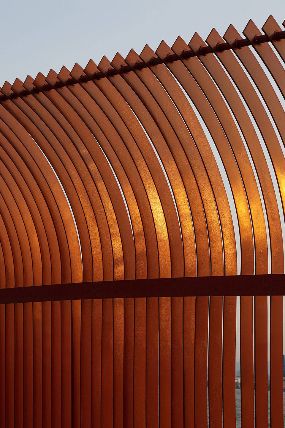 當(dāng)路人和騎行者從橋上經(jīng)過時,他們將成為橋梁立面的一部分,通過與光影的互動創(chuàng)造出觀察者眼中變化的景觀。海港步道上的行人可以在不同的時間和速度下感受橋的不同氛圍。這種動態(tài)的效果對于交通結(jié)構(gòu)而言是十分合適的。