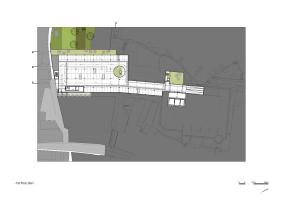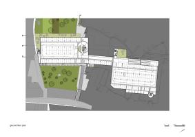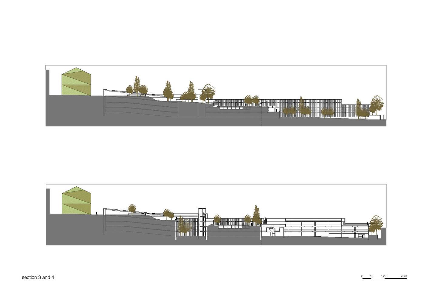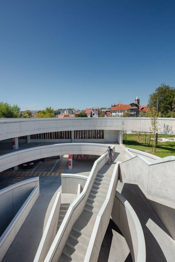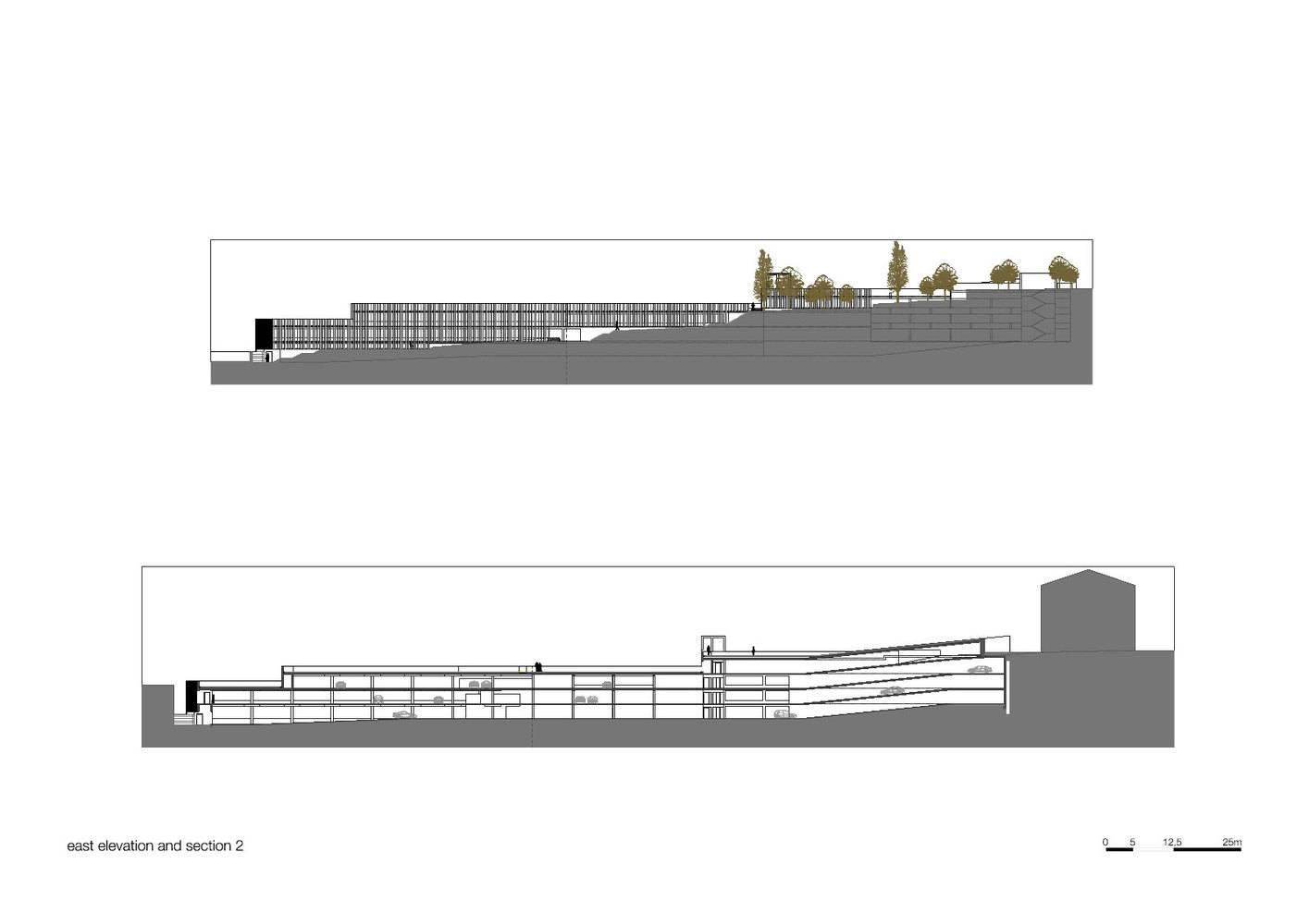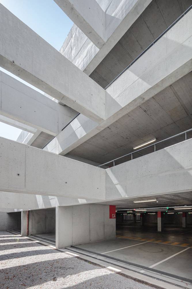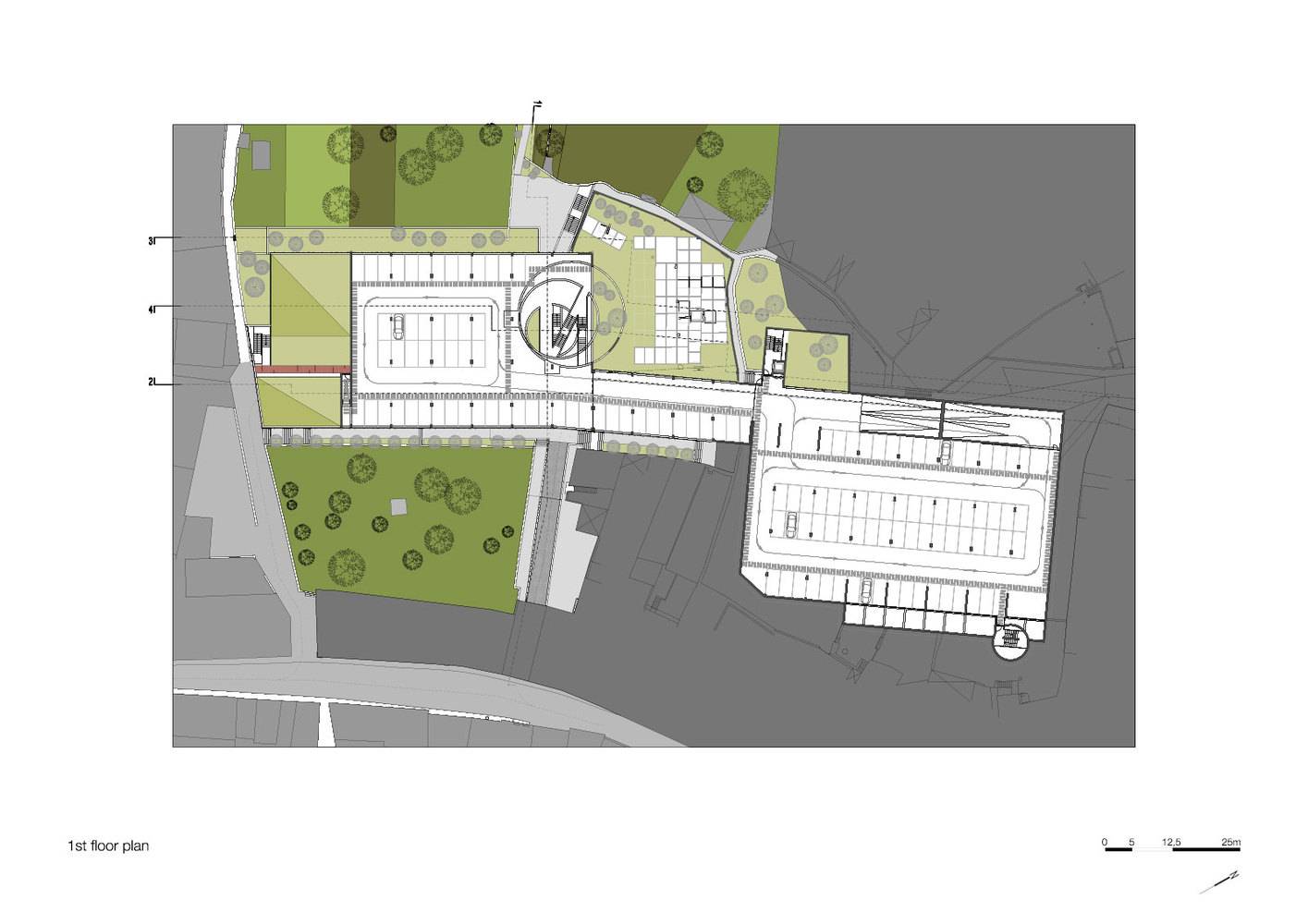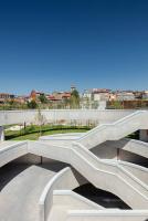項目可被概括為三層樓板,屋頂,及周邊景觀的空間組合。建筑內(nèi)部設(shè)置了良好的通風(fēng)和煙霧疏散設(shè)施,可為500輛汽車提供停泊服務(wù)。該項目位于歷史街區(qū)內(nèi),處于城墻和附屬廣場之間。