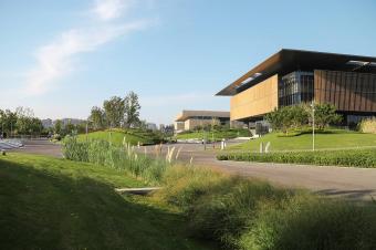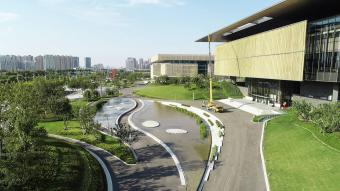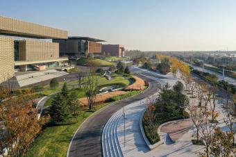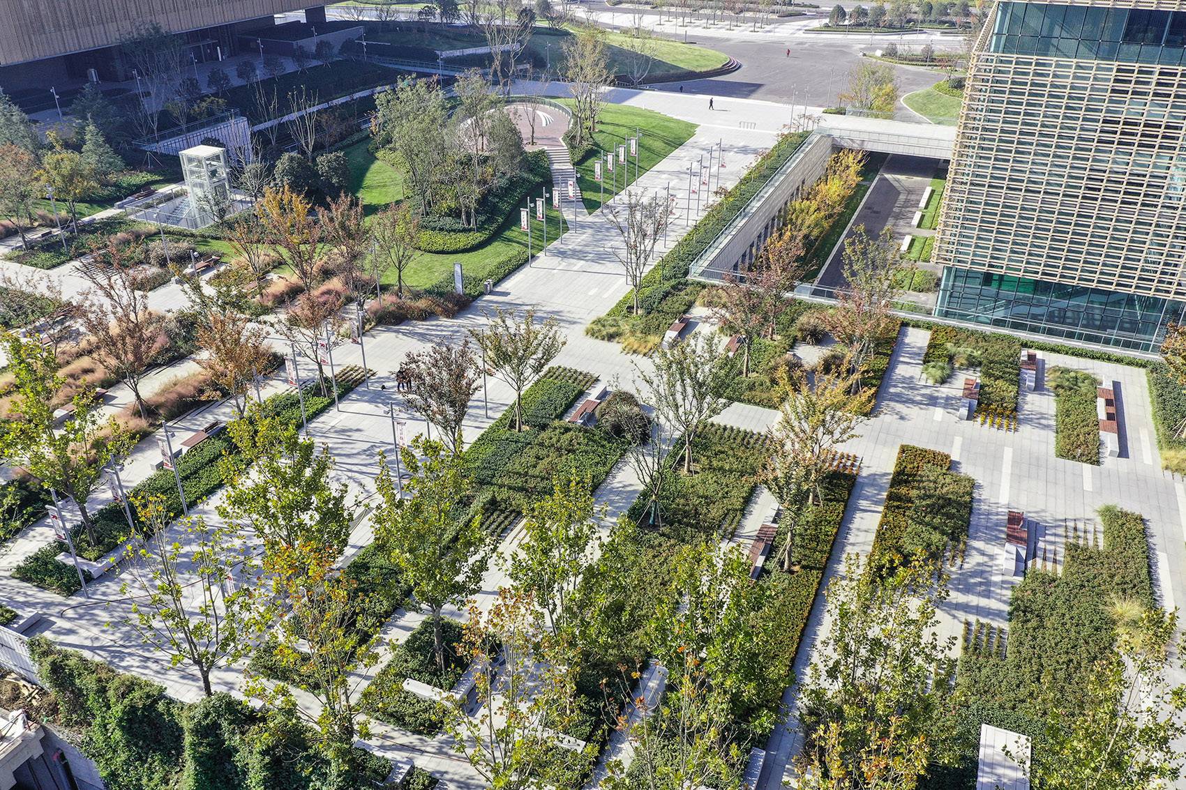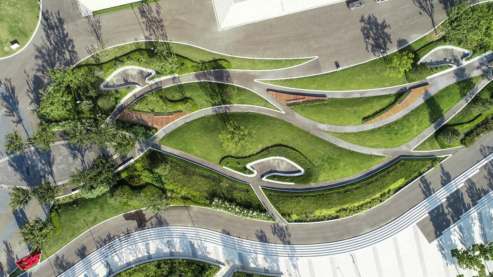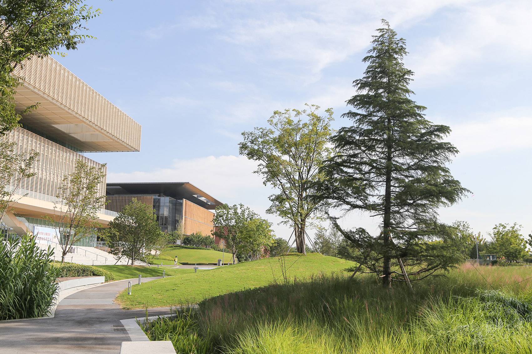 濟寧文化中心一期景觀在深刻解讀規(guī)劃結(jié)構(gòu)、建筑特點的基礎之上,實施了各具特色的高地公園、綠谷的景觀塑造,并通過整體的豎向設計,全面完整地重構(gòu)了建筑的在地關系。同時用海綿城市的理念,將生態(tài)工程技術(shù)融入到景觀設計當中,使得該項目無論對空間結(jié)構(gòu)、交通體系、環(huán)境氛圍、生態(tài)持續(xù)等景觀自身理念的多元兼顧,還是在景觀和這些“唯一性”的世界級建筑之間的空間融合等方面都取得了合諧共生,有機縫合的整體關系。