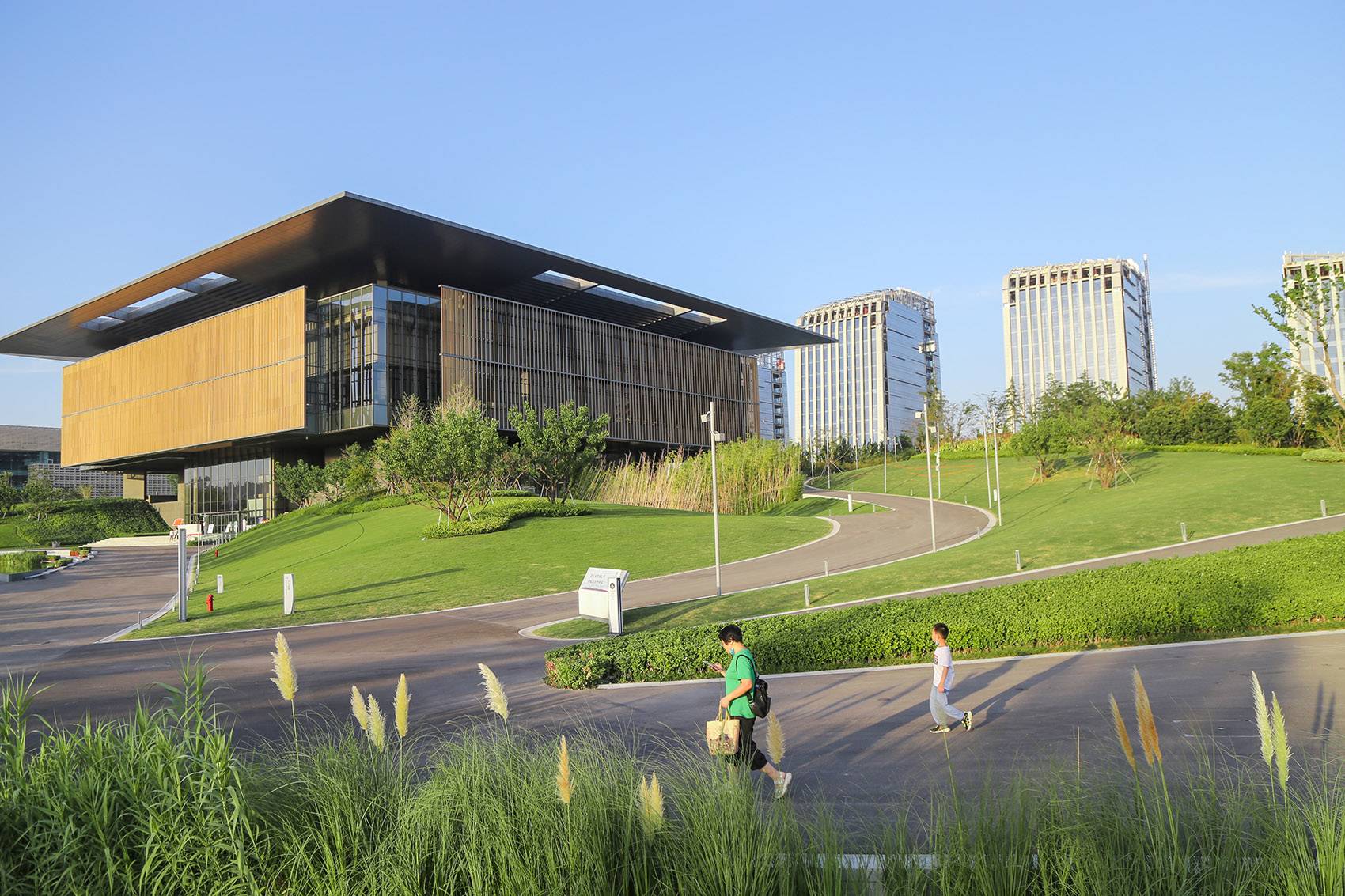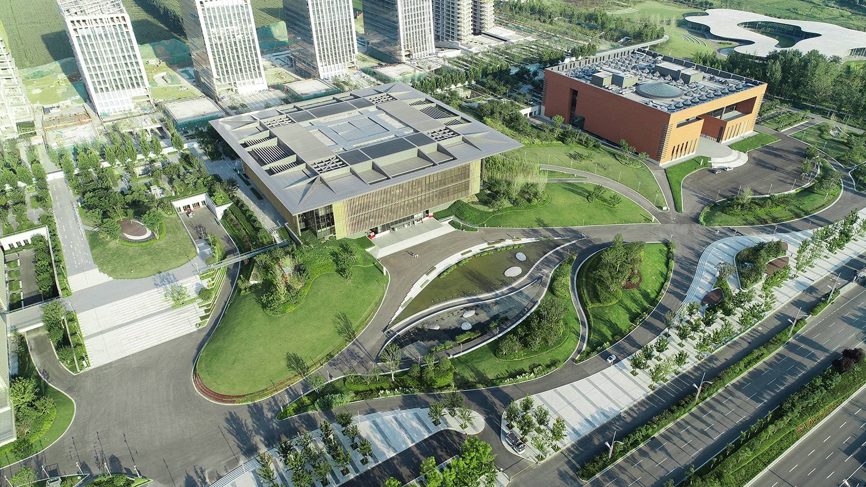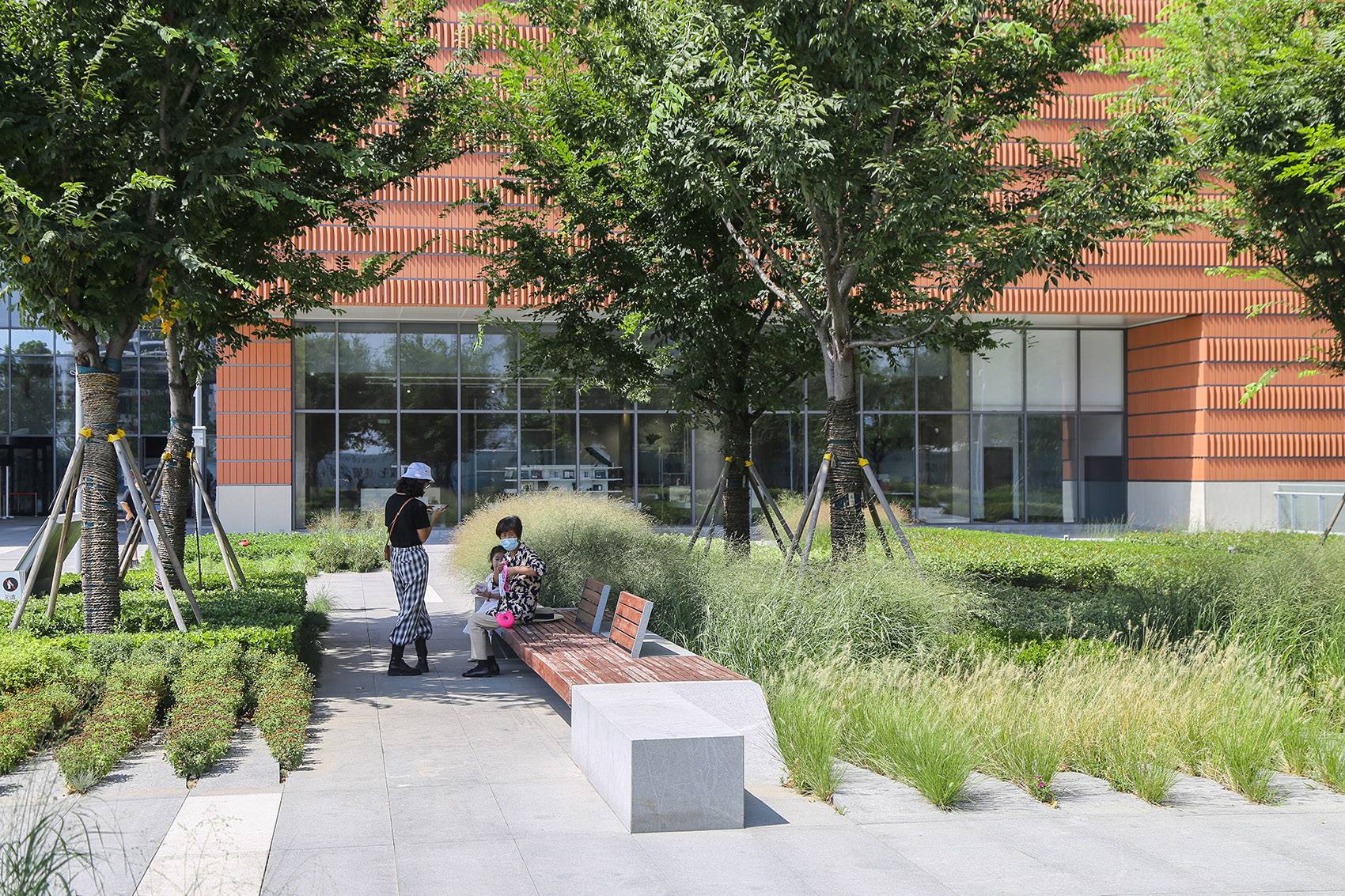 The rational modular space of the Highland Park and the free form of Green Valley form a strong contrast. From the perspective of the design effect, both rationality and freedom are indispensable, and they are the result of the best evolution of the individual characteristics of the building and its group relationship. It is also the result of the functional requirements of the building itself. Between the highland and the green valley, that is, the transitional space between rationality and freedom, boldly “paint” the green slope, and use the infiltration of a free mass of “shuttle-shaped” slope land to blur the difference between the two, the natural landscape has become the best background for architecture, rubbing the original monotonous and blunt architectural boundaries into vivid and soft. The cultural venues not only maintain the internal structural order, but also present a harmonious and coexisting spatial relationship between highland and green valley, as well as the landscape and architecture.