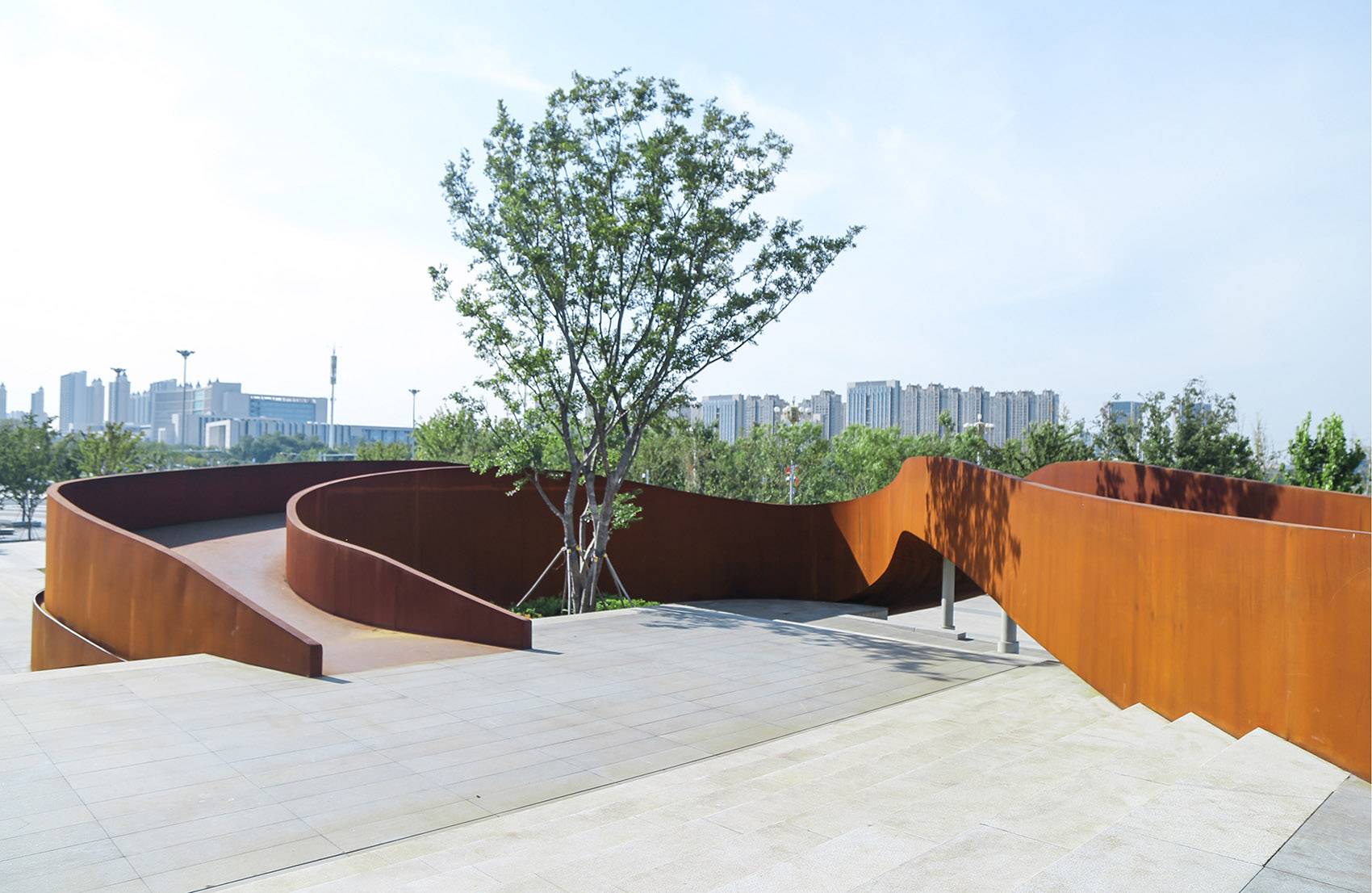 Since the main city of Jining is located to the north of the cultural center base, the north entrance not only carries a large number of people, but is also a gateway to the cultural center landscape. In the landscape layout, the north entrance is set at the intersection of Yunhe Road and Shengxian Road. People can easily enter the cultural center along the Yunhe Road to the south or east from Shengxian Road. A set of “L”-shaped large steps are set up from the north entrance to the highland park. This large step can be regarded as a continuation of the north entrance to the east. The large steps up from the west can reasonably solve the problem of the north axis of the highland park. “The ending question. At the same time, the northern slope of the large steps is relatively large. The “fold-shaped” barrier-free ramp and narrow side steps, greening, and fire-fighting channels are combined, which not only enriches the traffic flow, but also satisfies the leisure function of stopping and sitting. The difference also got a reasonable transition. In order to avoid the large steps and platforms from being too “stiff”, a regular large lawn and the LOGO arc wall of the cultural center are placed in the middle and lower parts of the large steps, which greatly enhances the visual orientation and enriches the spatial experience.