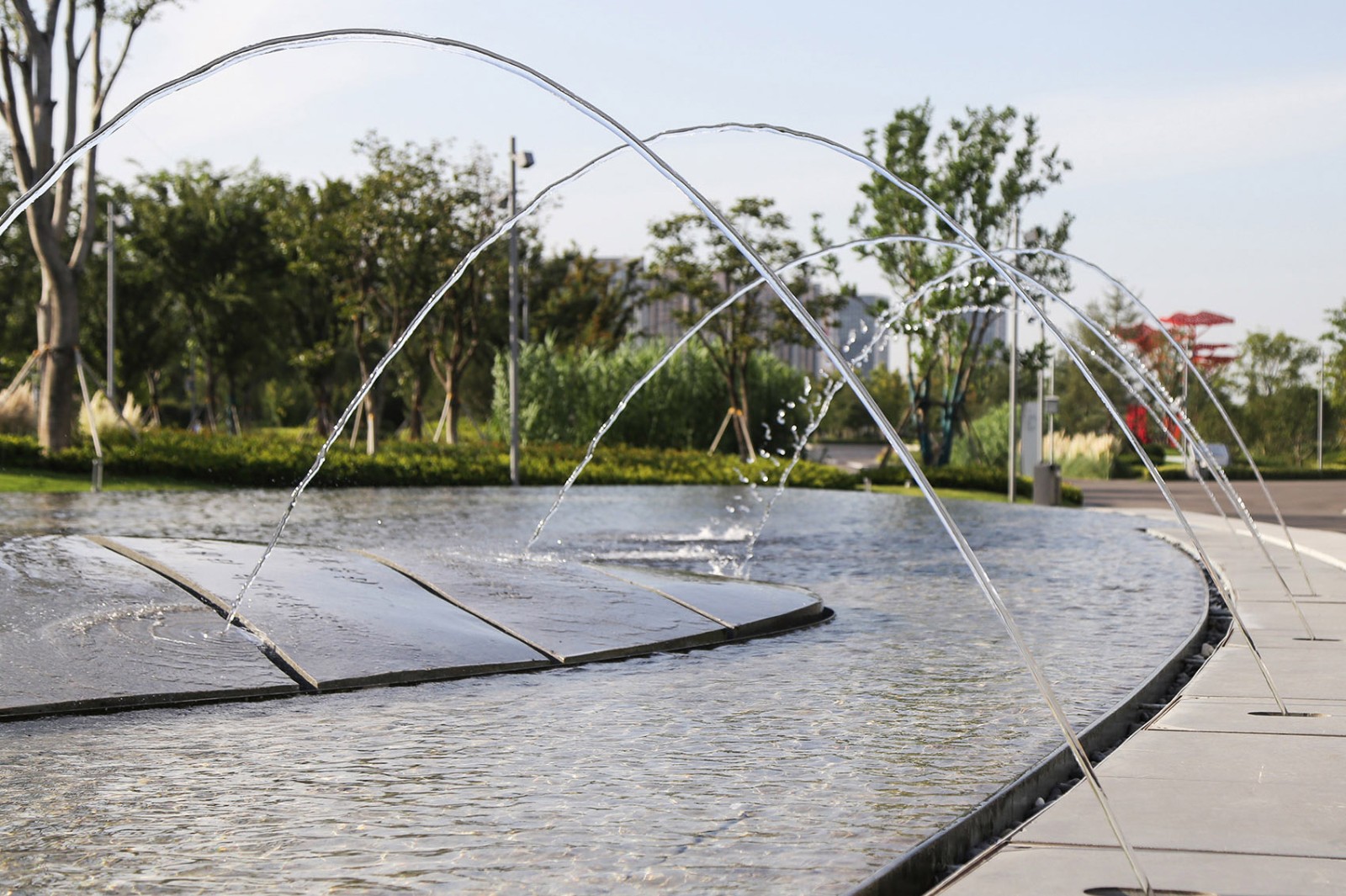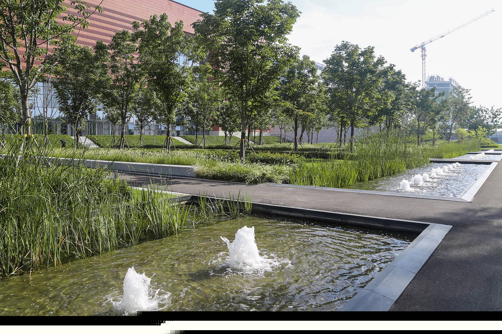 The greening of this project adopts a watering system that combines automatic sprinkler irrigation and drip irrigation to reduce manual maintenance and water consumption, and the water source uses collected rainwater (when rainwater is insufficient, the urban reclaimed water system can be switched). As the landscape waterscape requires high water quality, a water treatment room is set up in the slope underground cavity structure, and equipment is used for physical treatment. In this way, not only water quality can be guaranteed, but water resources can also be reused.