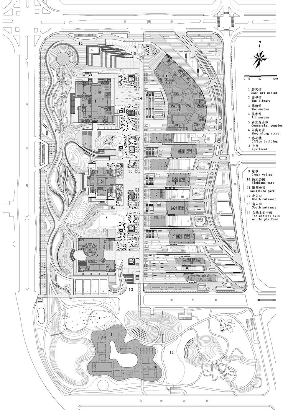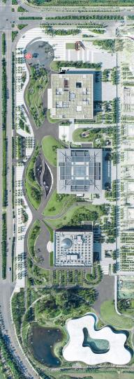 濟寧文化中心包括群藝館、圖書館、博物館、美術(shù)館以及配套的商業(yè)綜合體。項目從構(gòu)想之初就不同凡響,建筑設計競賽邀約了包括磯崎新(Arata Isozaki,2019普利茲克獎得主)、馬里奧·博塔(Mario Botta)、西澤立衛(wèi)(Nishizawa Ryue, 2010普利茲克獎得主)、何鏡堂院士等世界一流大師和知名的建筑設計單位參與。這是一個難度極大的挑戰(zhàn),濟寧文化中心集“文娛、藝術(shù)、展覽、收藏、創(chuàng)作、商業(yè)”等多元功能為一體,各個建筑單體既需要在世界級建筑大師們的創(chuàng)作之下呈現(xiàn)“唯一性”的特色,又需要相互融合,和諧共生。景觀的參與和實踐正是遵循“有機縫合”這一基本原則,來塑造“整體、共情、協(xié)調(diào)”的外部公共環(huán)境,把多樣化的城市文化公共建筑,通過景觀環(huán)境的創(chuàng)新思維有機地融合為整體,共同構(gòu)建了文化中心這一綜合體,建筑與景觀的相得益彰造就了濟寧市新的文化地標和“城市名片”。
