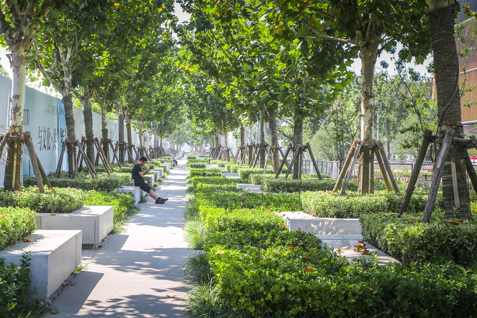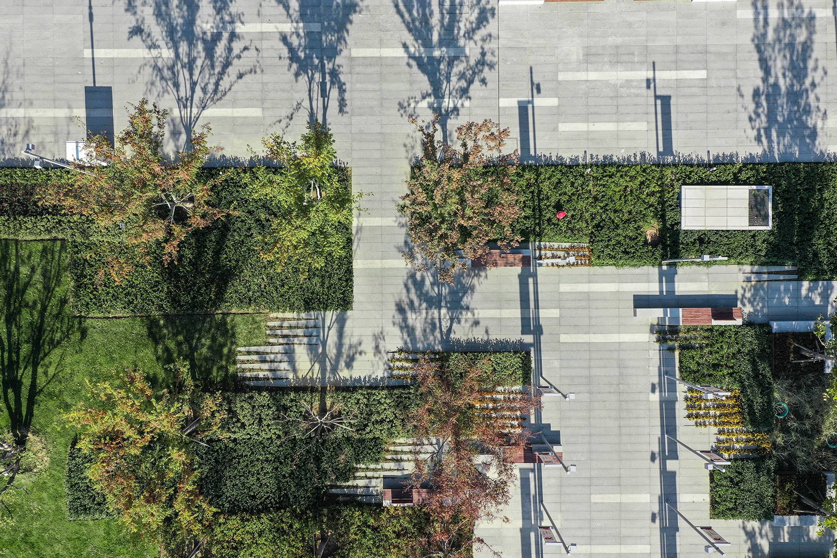 Due to the large area of the Highland Park, the east and west wings of the commercial buildings and cultural venues are arranged side by side. These buildings have main or multiple entrances and exits on the highlands. Therefore, the Highland Park is a living room where people flow like weaving. From the perspective of traffic accessibility and architectural functions, the landscape has a central axis of 11.2 meters wide along the north-south direction, and perpendicular to the central axis is a row-like green belt with uniform planting modules. The central axis of the dominant direction connects the main entrance plaza in front of each building in series, and the vertical row of green belts can penetrate the flow of people to the corners of the high ground, which not only reasonably solves the problem of the flow of people, but also takes into account The setting of fire escape and fire climbing surface. On both sides of the central axis are planted double rows of tree-shaded paulownia, combined with the beech tree array on both sides, the axis is more “ritual”. The central axis of etiquette, the entrance square that highlights the building, and the rainwater gardens in groups. The space divisions on these high grounds are very clear and rational, but the functions and forms are rich and compact, and at the same time “open” squares. The rainwater garden with ” plentiful” also naturally formed a spatial sequence of “opening and closing” of the highland landscape.