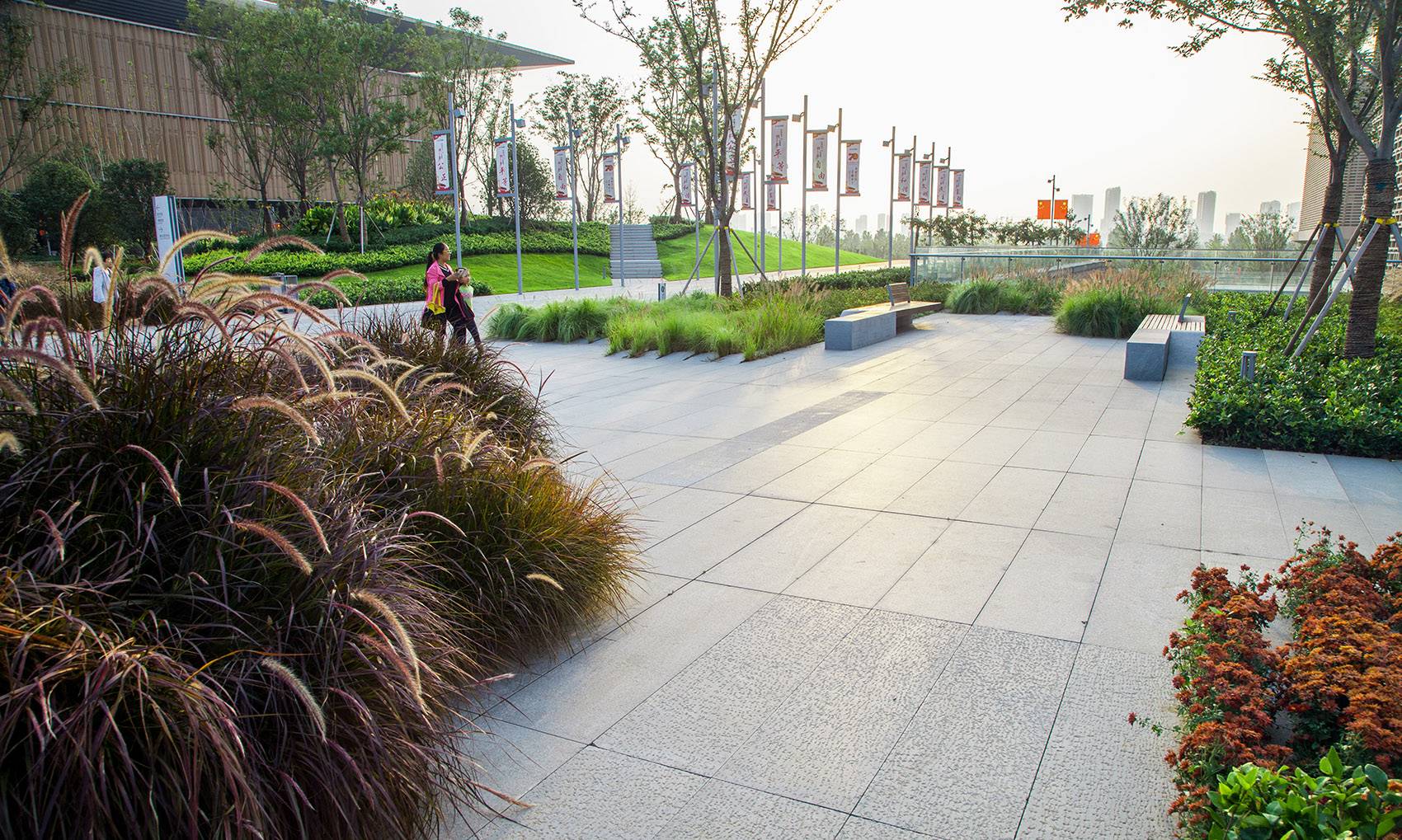 文化中心景觀試圖嘗試介入“輕柔”的,且具有生命力的自然景觀來化解基地及建筑彼此間的“矛盾”,通過綠化、坡地、樹陣、臺地等樸素的景觀元素來整合區(qū)域內(nèi)的場地與豎向,使得龐大的人工建筑環(huán)境通過自然元素的滲透和融合得以消解。這種介入方式看起來有點“平淡”,但經(jīng)過精細的細節(jié)處理,產(chǎn)生了一種開放空間尺度層次相宜,動靜功能組合相得益彰,自然和人工交替可持續(xù)的景觀環(huán)境,似乎高標準的創(chuàng)造了景觀與建筑 “和諧共生”的理想場所。