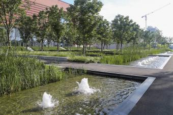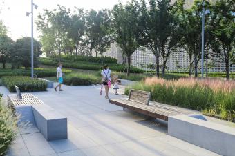 高地公園景觀面積為33000平方米,共設有五處雨洪花園(面積約16300平方米),用于收集來自廣場、場地、屋頂?shù)挠晁?。雨洪花園通過生態(tài)工程的技術(shù)手段,全面實施了海綿城市“滲、滯、蓄、凈、用、排”的六字方針。