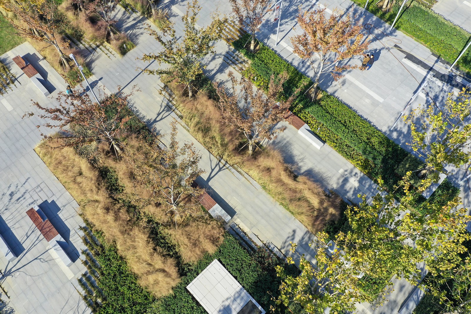 As a depression, Green Valley is the lowest place in the cultural center. The pavement of the site is all made of flexible permeable asphalt. The undulating overall shape of the road is more conducive to drainage and water seepage. At the same time, a 600-meter-long, 2-meter-wide, and 0.5-meter-deep grass ditch was arranged at the lowest depression to collect rainwater from the entire green valley. The planting ditch can store 600 cubic meters of water. After the rainwater in the ditch is saturated, it can be discharged into the municipal rainwater pipe network system through the overflow well to achieve the purpose of “slow discharge and slow release”. Zhicaogou is planted with diverse wet plants, which enriches the landscape level and effect.