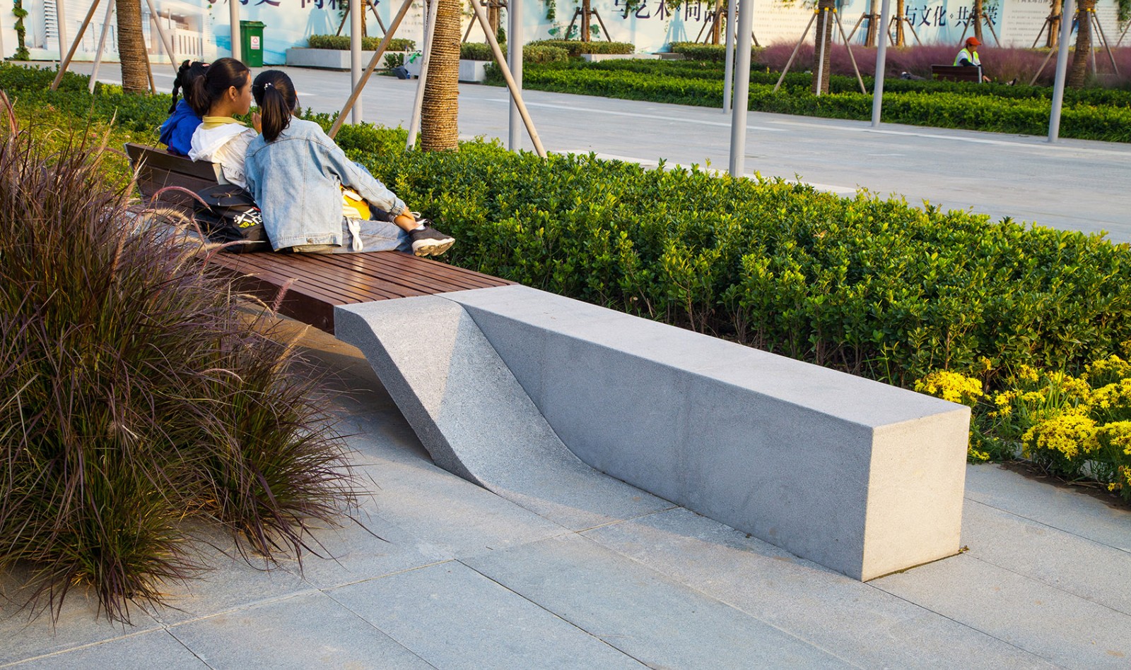 ▲人行道邊供人休息的硬質(zhì)座椅,seatings at the sides of the pedestrian for people to rest ?LDG/熊世寶、肖滔、何深華