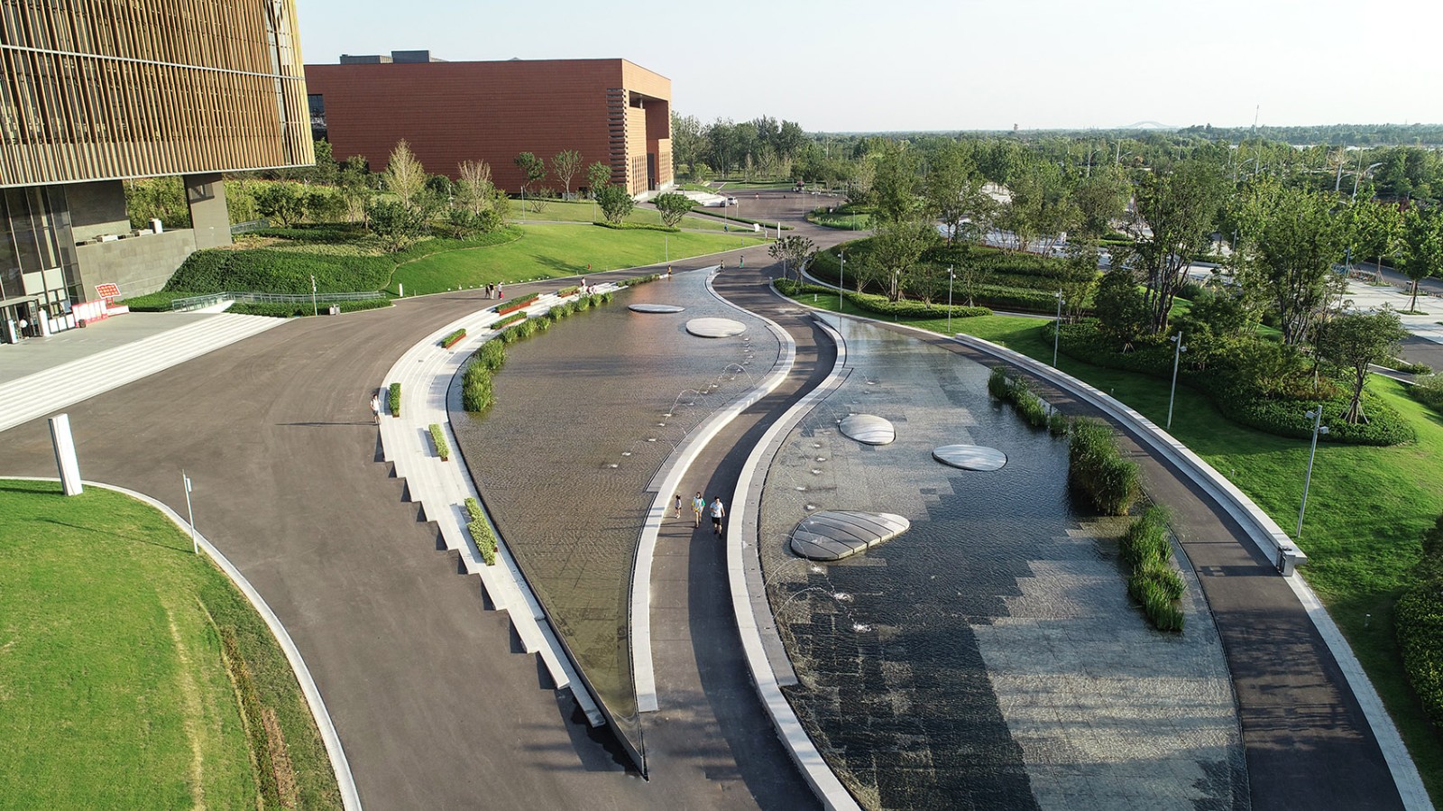 A small number of outdoor motor vehicle parking lots are set up along Shengxian Road and Canal Road, as well as taxi waiting areas and bicycle parking areas. There is no standard motor vehicle lane in the base. In order to meet the needs of building fire protection and management, non-standard roadway design is carried out in the landscape. Through free-form organization, the requirements of the roadway and fire climbing surface are ingeniously interpreted in the park road. , Squares, and hard grounds, eventually forming an integrated landscape effect. At the same time, with the help of a non-standard lane system, Green Valley has opened up a VIP vehicle flow line, which can quickly reach the main entrance of each stadium building from the Canal Road, and is flexibly equipped with VIP temporary parking spaces at the entrance.