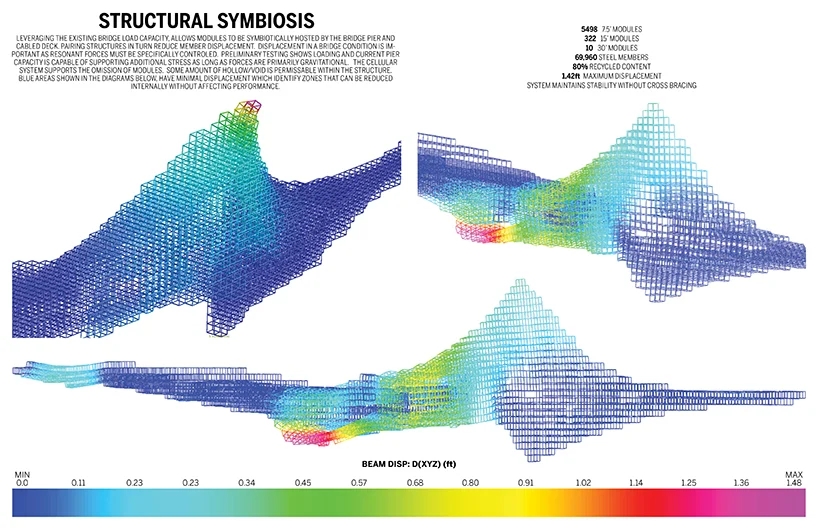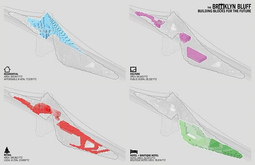 通過該提案,公眾認識到未來是被過去在表面和象征意義上都支持著的,也認識到了二者之間的共生關(guān)系。與原有大橋的雄偉宏大一樣,“布魯克林懸崖”通過依靠碼頭而利用了原結(jié)構(gòu),而懸索結(jié)構(gòu)在平衡狀態(tài)下支撐著懸臂跨度。一個元素是基于歷史,而另一個則面向未來,建立一種現(xiàn)代基礎(chǔ)設(shè)施類型學(xué)。