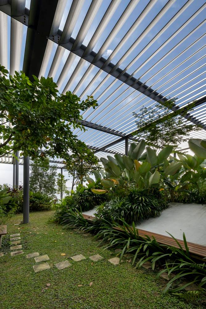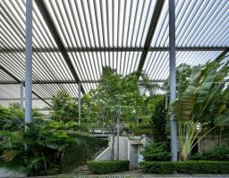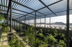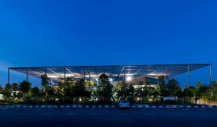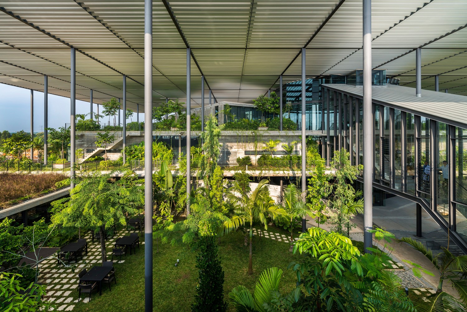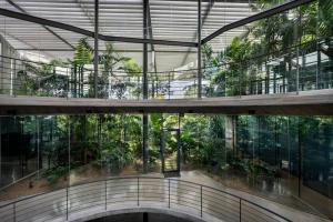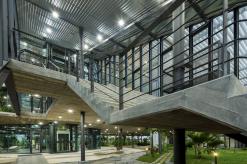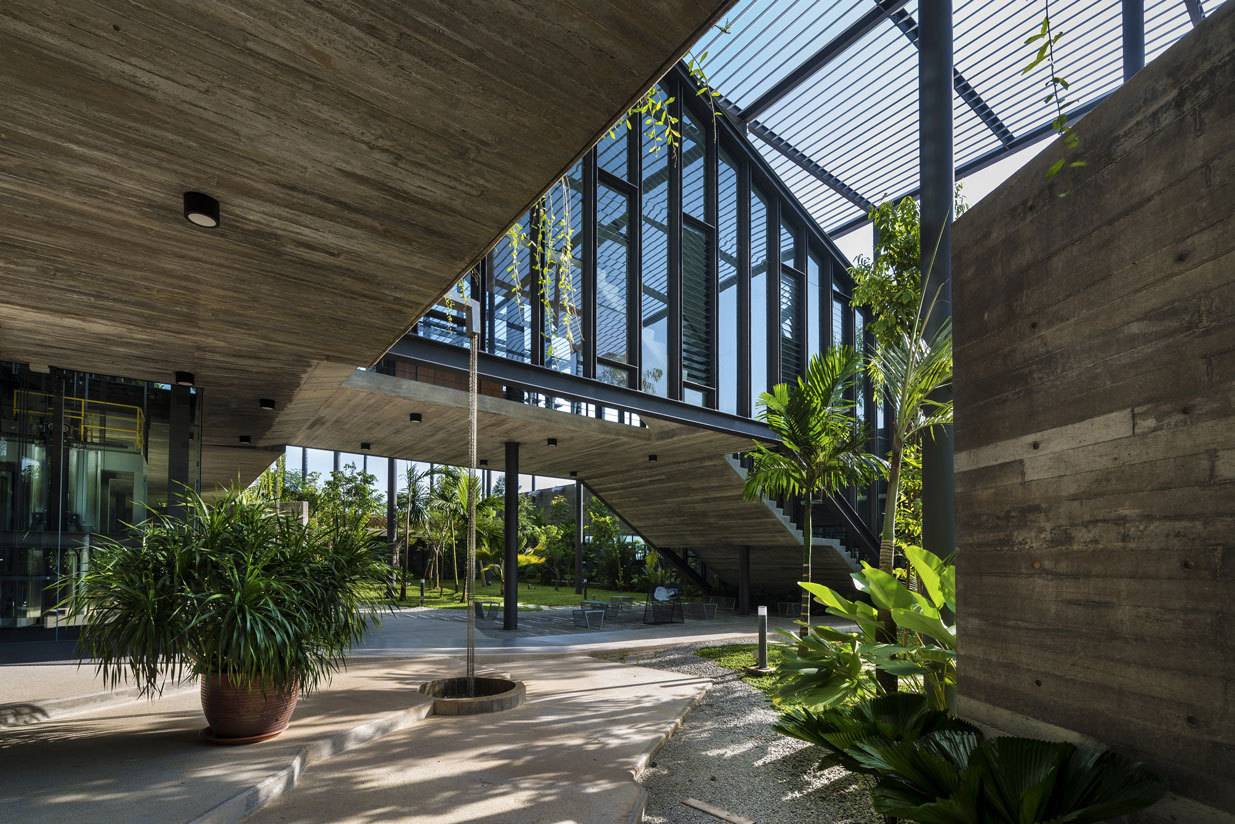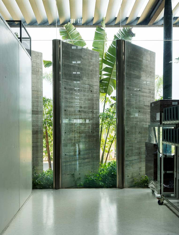 該項(xiàng)目為電子產(chǎn)品制造工廠建筑競(jìng)賽的最終獲獎(jiǎng)作品建成。場(chǎng)地位于穿透、圍繞、跨越建筑的一片森林之中,也因此建筑與自然的聯(lián)系被最大化,建筑里外都充溢著綠色、微風(fēng)、花香、鳥(niǎo)語(yǔ)和觸覺(jué)體驗(yàn)。由圓柱“森林”支撐的頂棚與辦公室和庭院連為一體,為人們提供熱帶陽(yáng)光下的保護(hù)傘。辦公室層通向屋頂花園,以此鼓勵(lì)員工們出外休息、開(kāi)會(huì)及思考。