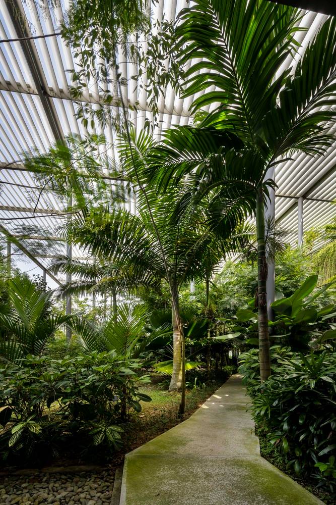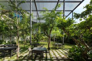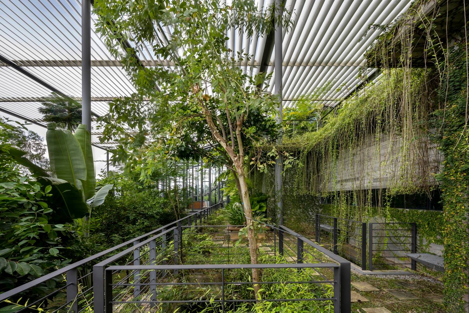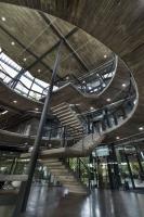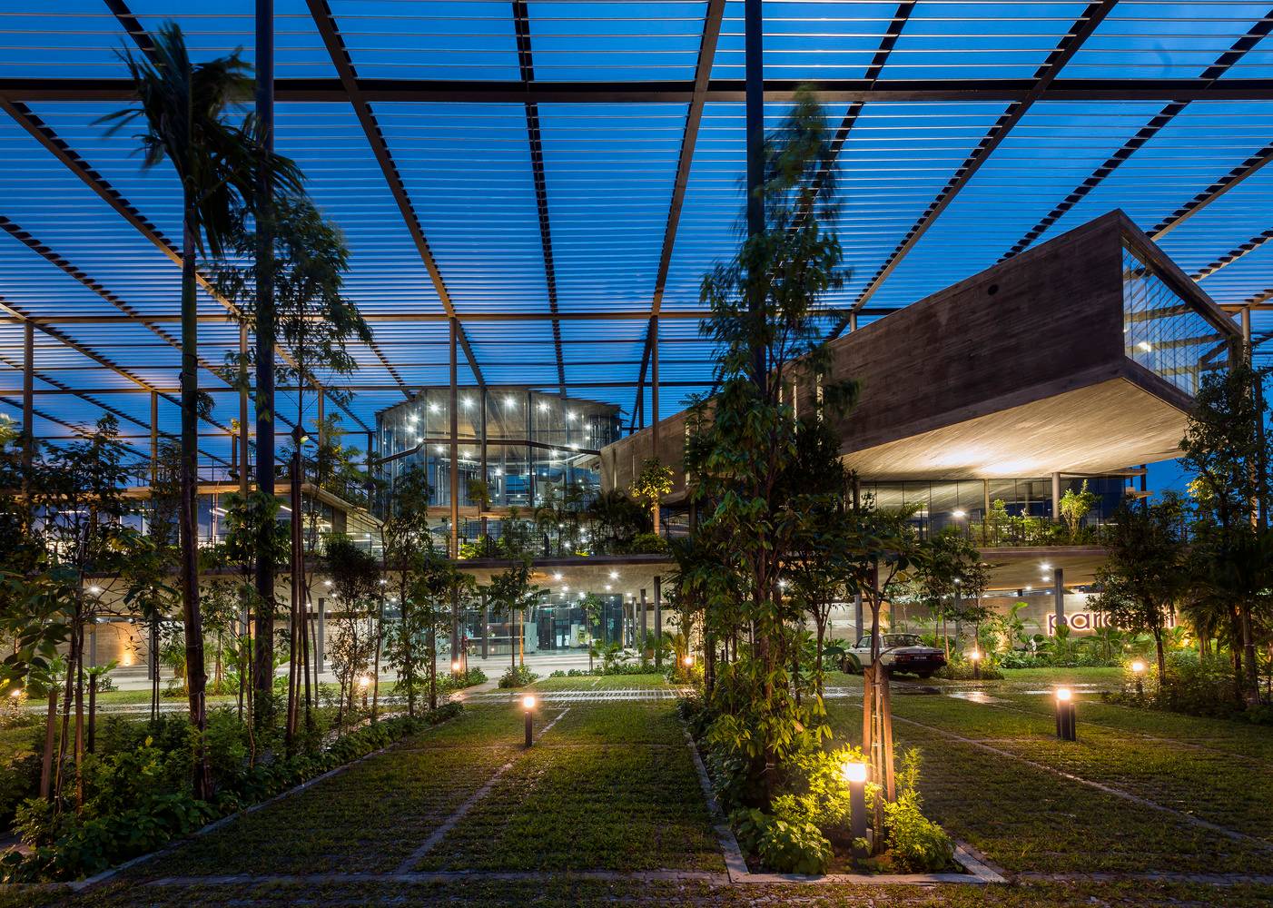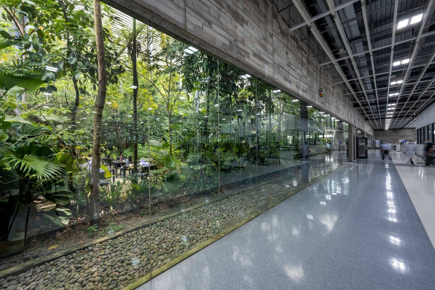 該項(xiàng)目為電子產(chǎn)品制造工廠建筑競(jìng)賽的最終獲獎(jiǎng)作品建成。場(chǎng)地位于穿透、圍繞、跨越建筑的一片森林之中,也因此建筑與自然的聯(lián)系被最大化,建筑里外都充溢著綠色、微風(fēng)、花香、鳥(niǎo)語(yǔ)和觸覺(jué)體驗(yàn)。由圓柱“森林”支撐的頂棚與辦公室和庭院連為一體,為人們提供熱帶陽(yáng)光下的保護(hù)傘。辦公室層通向屋頂花園,以此鼓勵(lì)員工們出外休息、開(kāi)會(huì)及思考。
