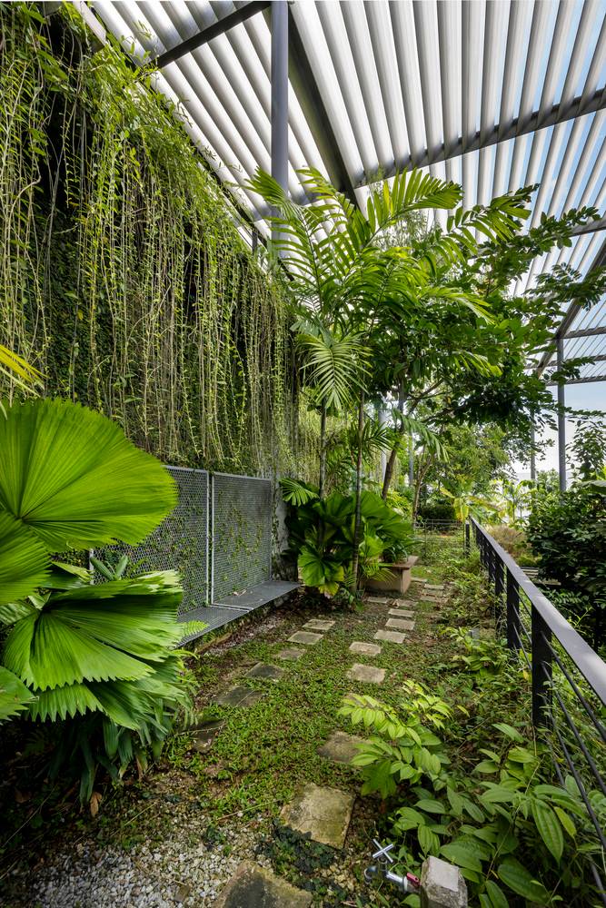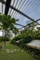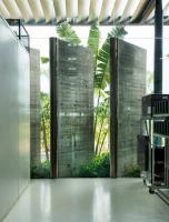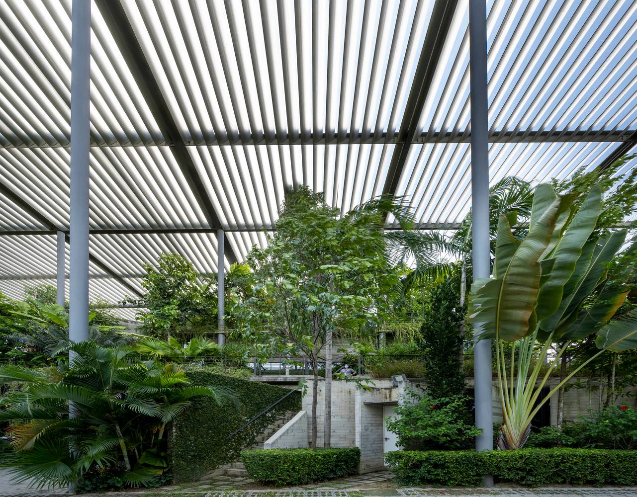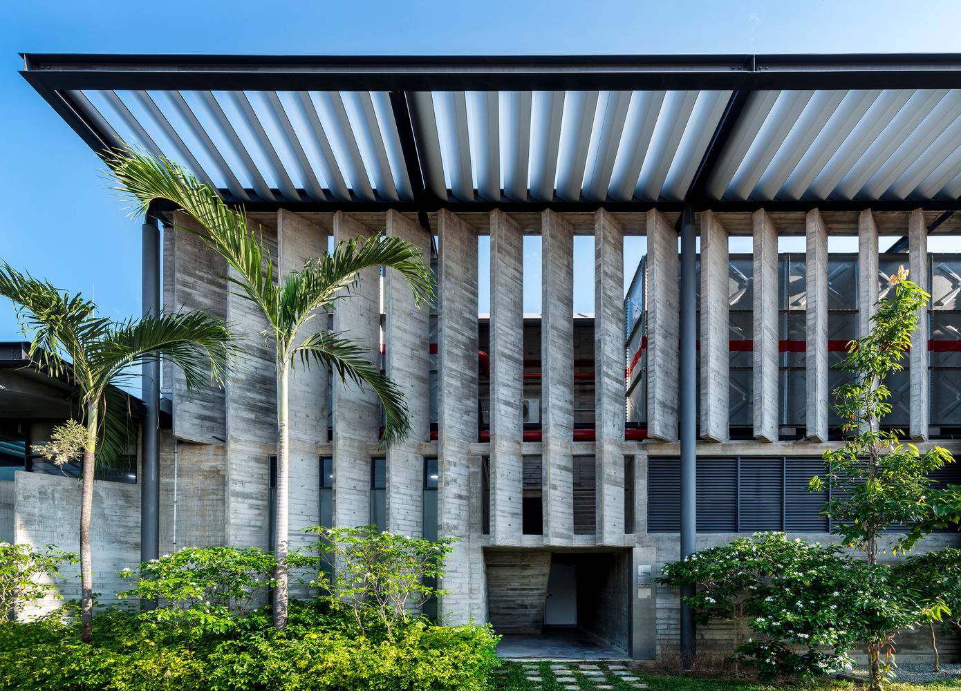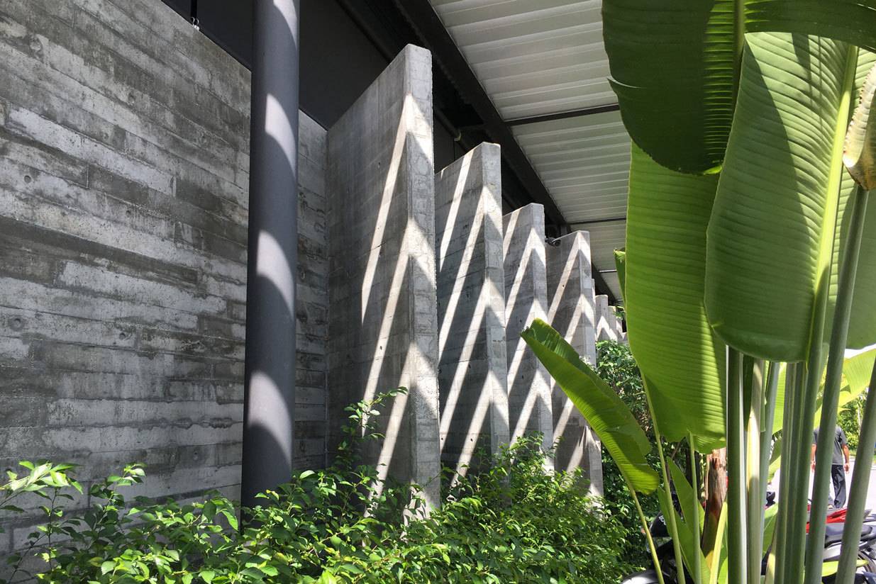 綠色庭院分隔了辦公室與生產(chǎn)工廠,這兩個(gè)空間彼此遙遙相望并互相連通。庭院上有連橋連接辦公室和工廠,也因此這一活動(dòng)空間也成為了人們會(huì)議、休息和講演的地方。工廠可以通過(guò)落地窗和天窗看向周圍景觀和天空,這些窗戶與獨(dú)立異形混凝土肋條和屋頂百葉則遮擋住了猛烈的光線。雨水從屋頂噴口流下,這也讓人們加強(qiáng)了對(duì)熱帶風(fēng)暴的意識(shí),同時(shí)也將水引至用于景觀灌溉的儲(chǔ)水罐中。