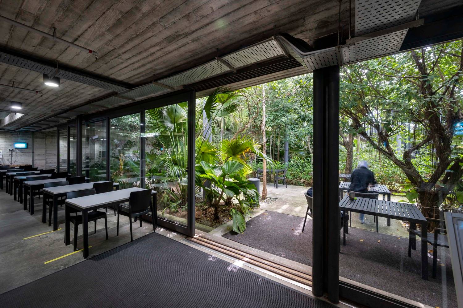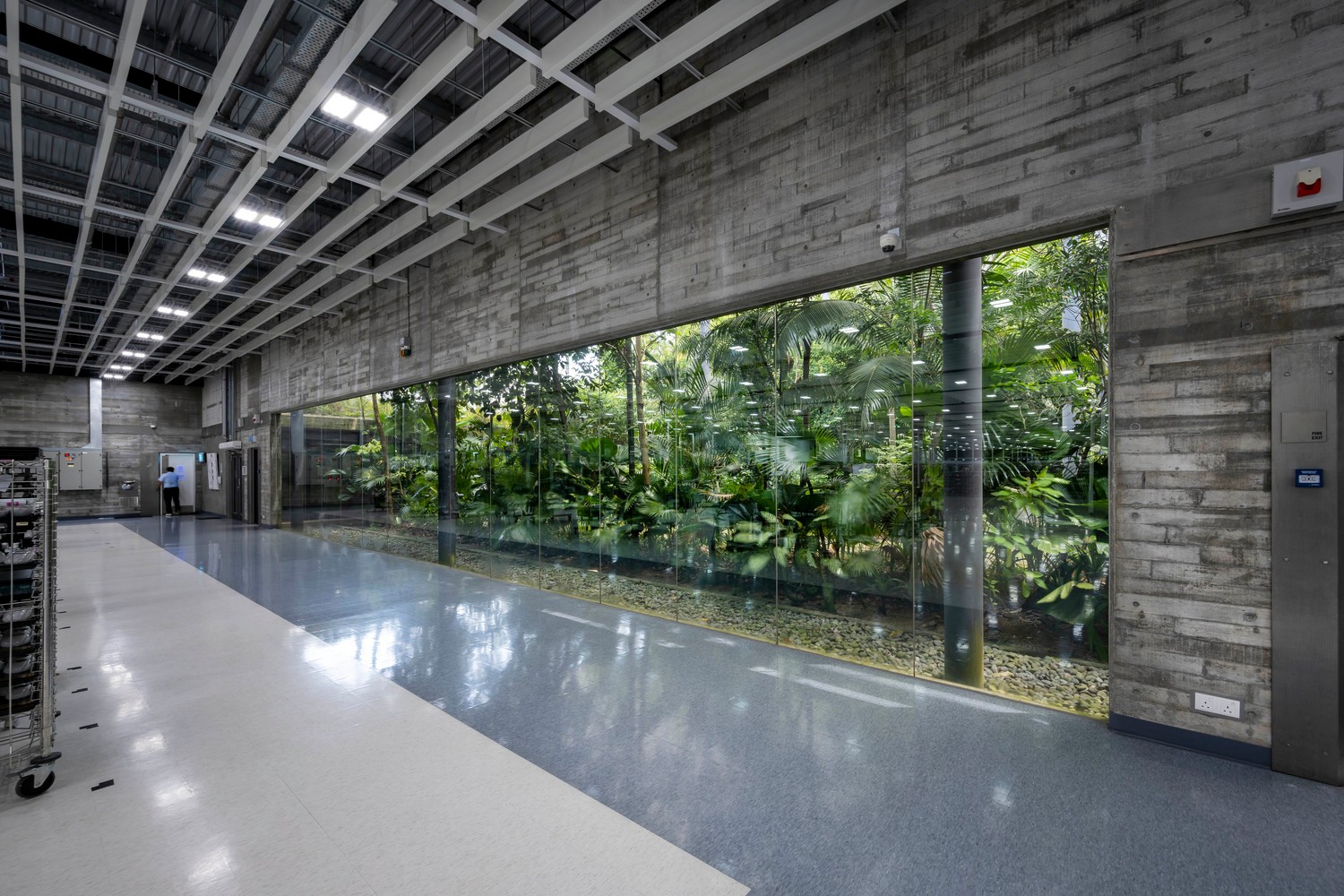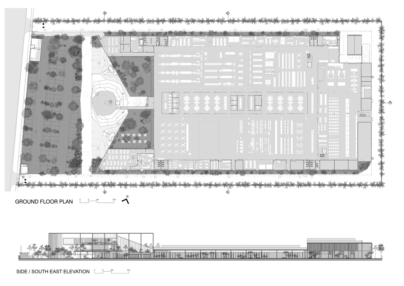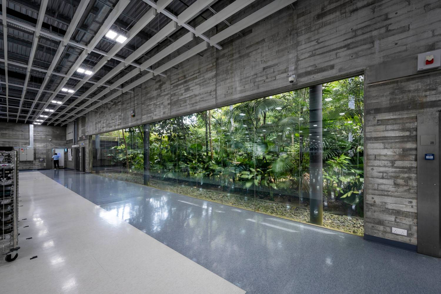 綠色庭院分隔了辦公室與生產(chǎn)工廠,這兩個(gè)空間彼此遙遙相望并互相連通。庭院上有連橋連接辦公室和工廠,也因此這一活動(dòng)空間也成為了人們會(huì)議、休息和講演的地方。工廠可以通過(guò)落地窗和天窗看向周圍景觀和天空,這些窗戶與獨(dú)立異形混凝土肋條和屋頂百葉則遮擋住了猛烈的光線。雨水從屋頂噴口流下,這也讓人們加強(qiáng)了對(duì)熱帶風(fēng)暴的意識(shí),同時(shí)也將水引至用于景觀灌溉的儲(chǔ)水罐中。