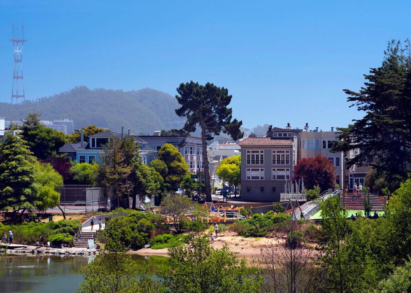 山湖公園游樂場(chǎng)在舊金山里士滿區(qū)內(nèi)一排愛德華七世時(shí)代建造的住宅后方,位于一片茂密的常綠樹林之中。游樂場(chǎng)沿場(chǎng)地的緩坡向下延伸,與軍營(yíng)國(guó)家公園南部邊界上的山湖湖岸相接。