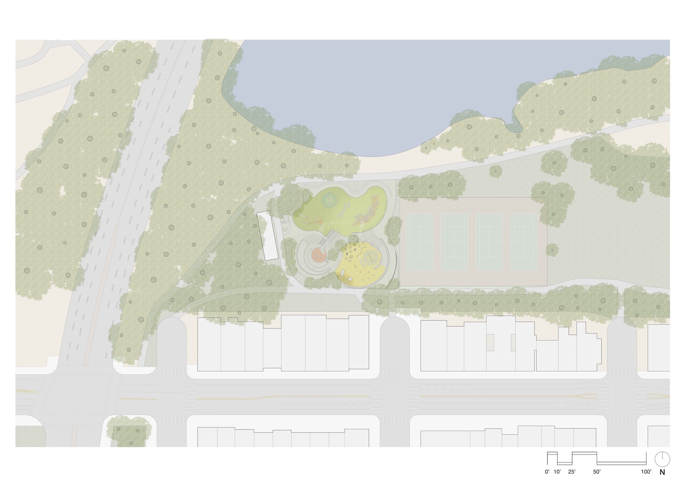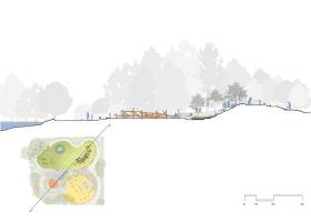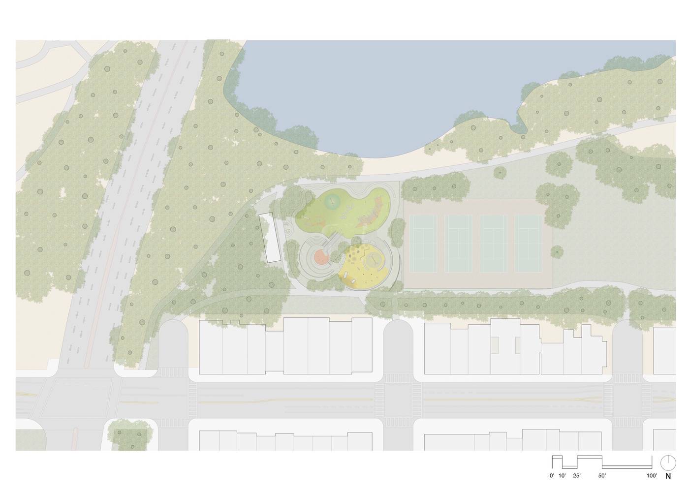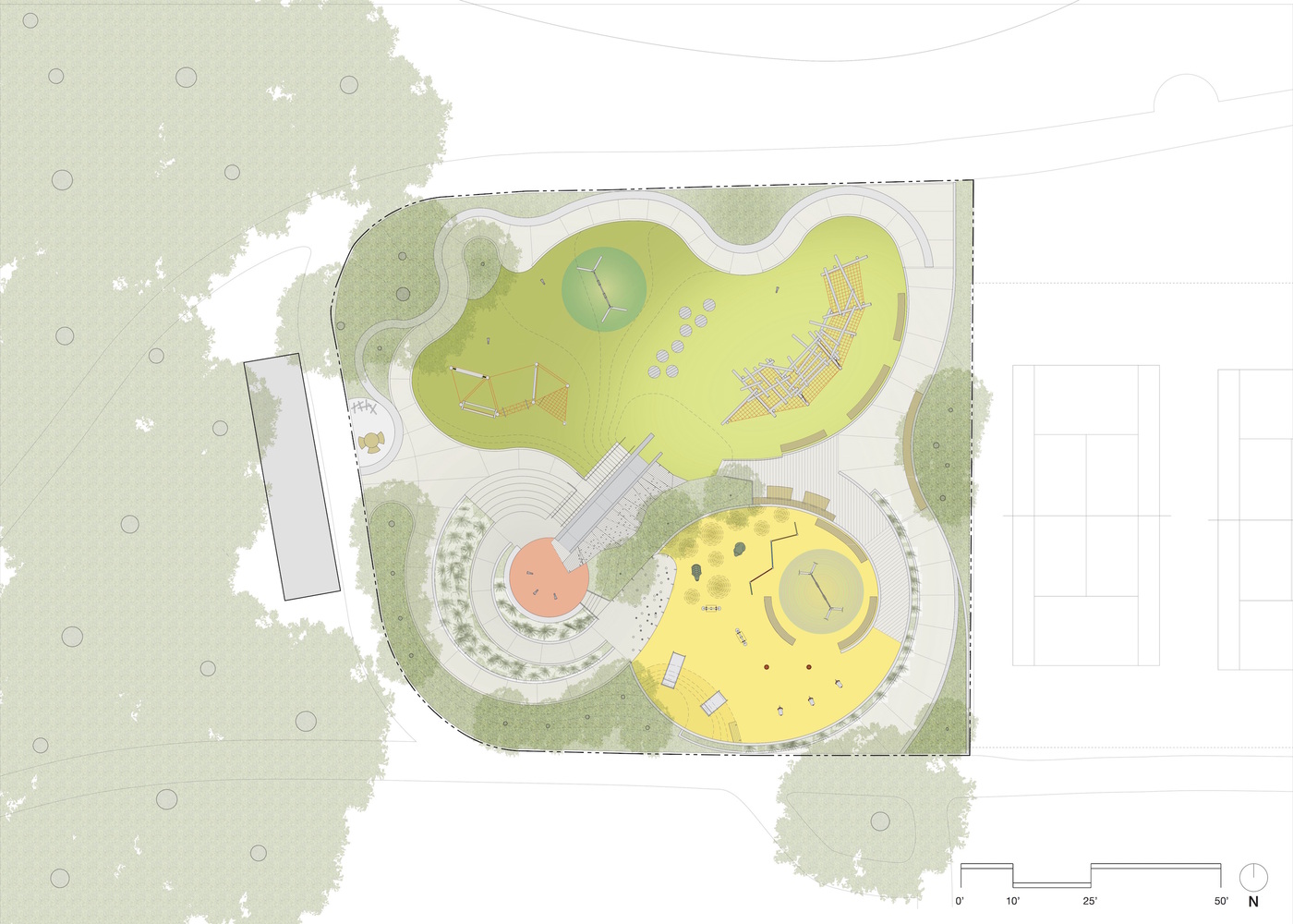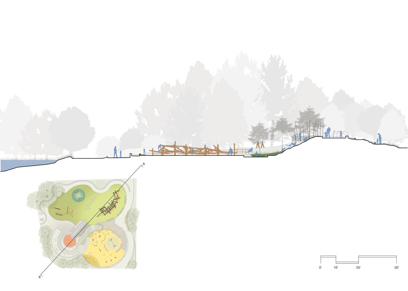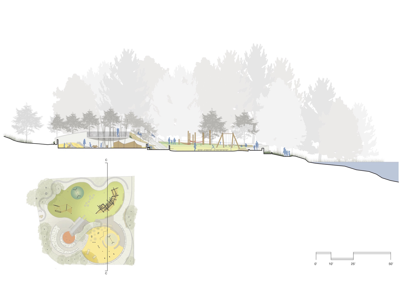 這個(gè)翻修過的游樂場(chǎng)充分利用了場(chǎng)地地形的優(yōu)勢(shì),在不同標(biāo)高的臺(tái)地上分別設(shè)置了獨(dú)立的游樂區(qū),它們根據(jù)兒童的年齡段和玩耍能力進(jìn)行組織和劃分,再通過一系列蜿蜒的路線聯(lián)系在一起,在游樂場(chǎng)內(nèi)提供一條能夠貫穿所有區(qū)域(包括頂部的滑梯在內(nèi))的路徑。