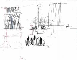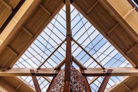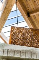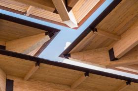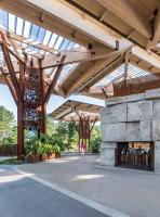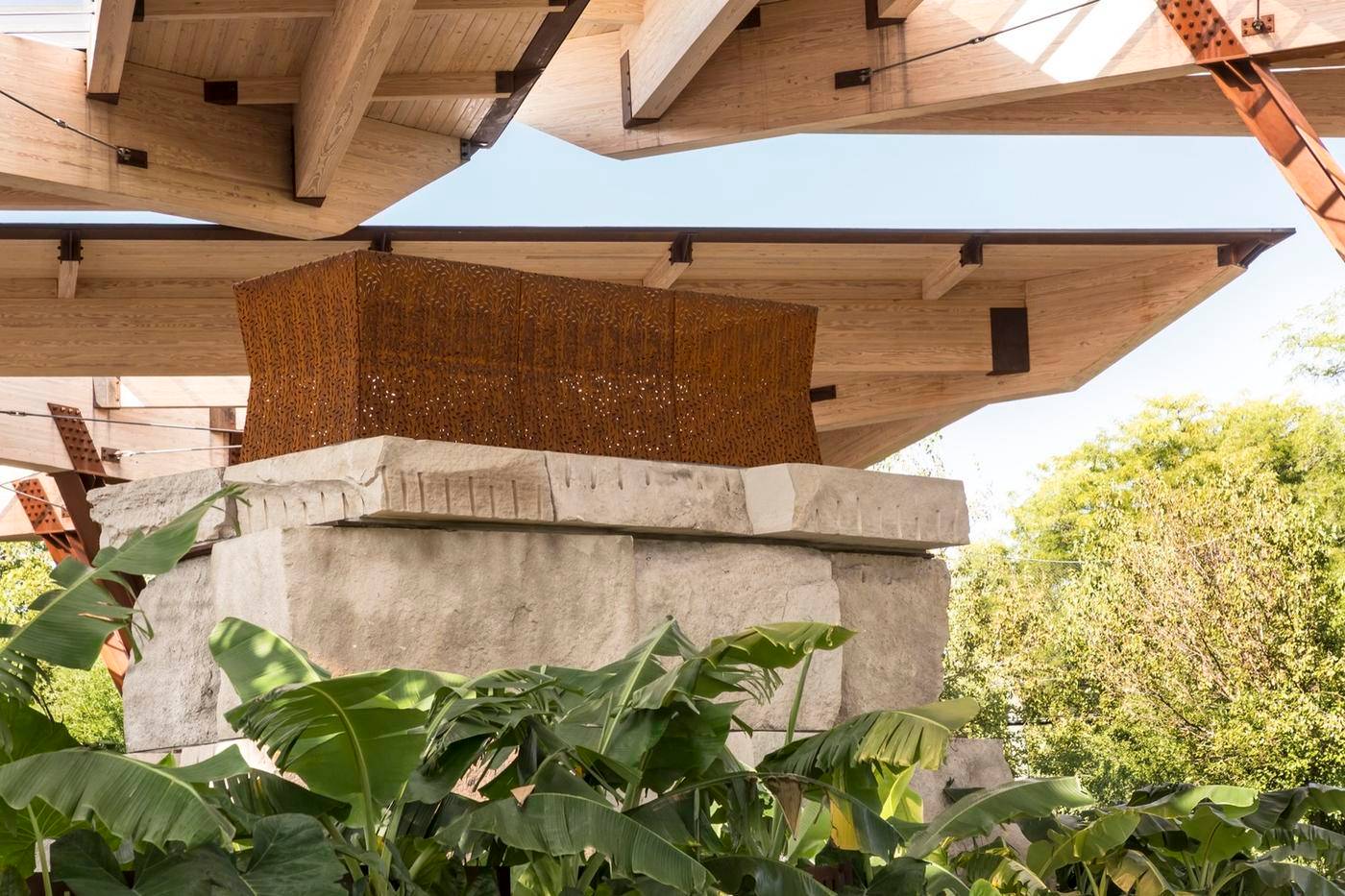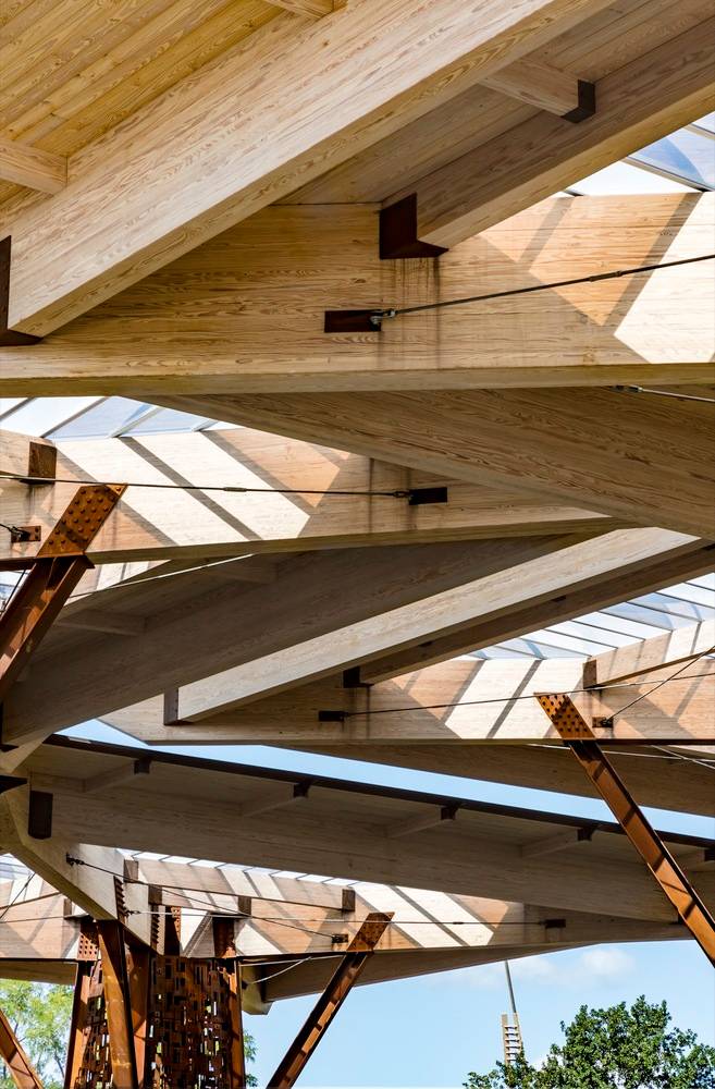 每一個(gè)亭子由63根獨(dú)立的木梁支撐起來(lái),長(zhǎng)度在83英尺長(zhǎng)、19000磅重至3英尺長(zhǎng)、25磅重不等。半透明的屋頂材料可以讓陽(yáng)光穿透并照射到地面,整個(gè)亭子“森林”共使用6424個(gè)螺栓和拉力螺釘固定在一起。在35英尺的天篷下面,一塊從采石場(chǎng)運(yùn)來(lái)的粗糙石灰石形成視覺(jué)中心,它還可以寒冷的天氣里向眾人供暖。