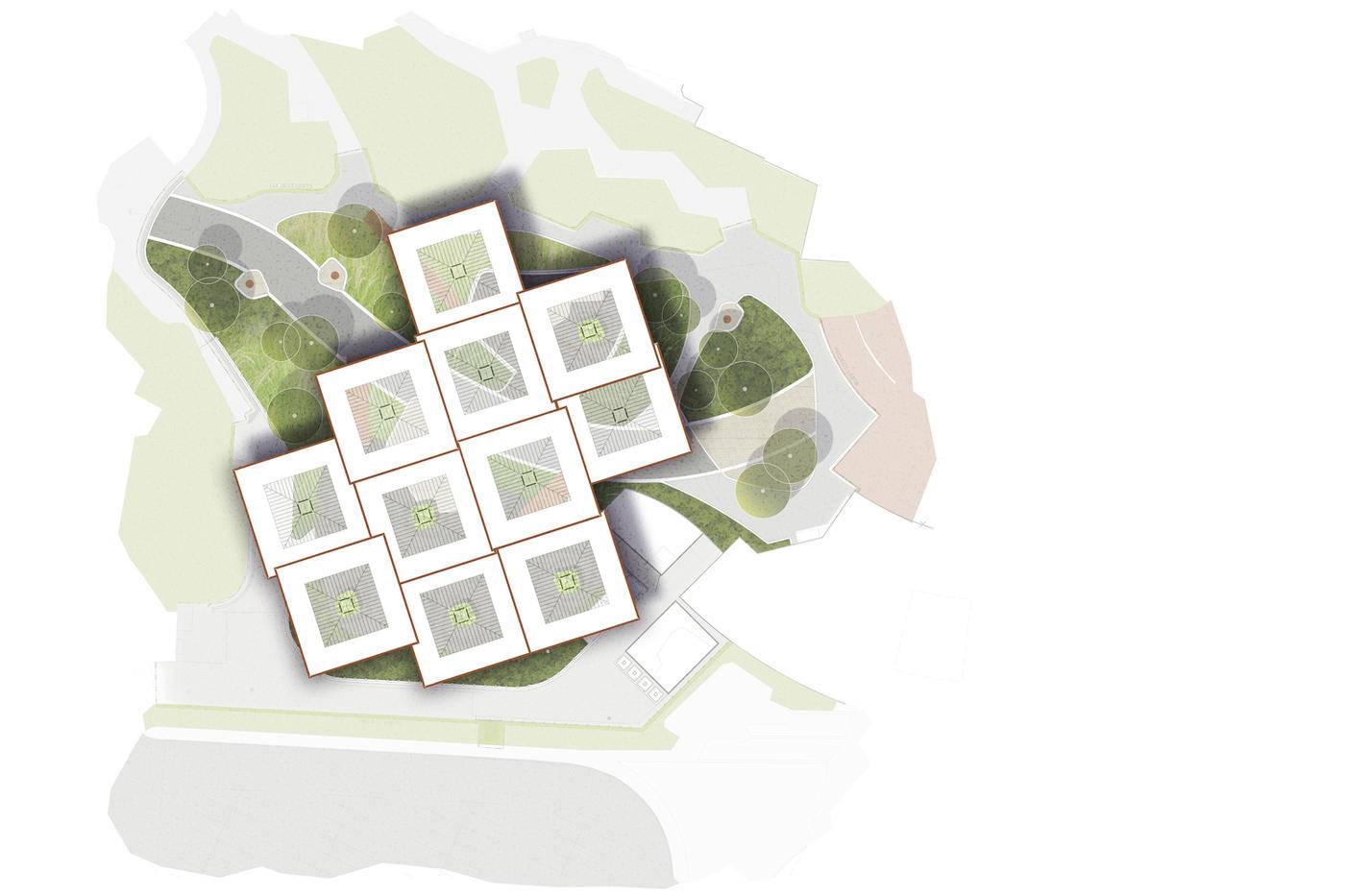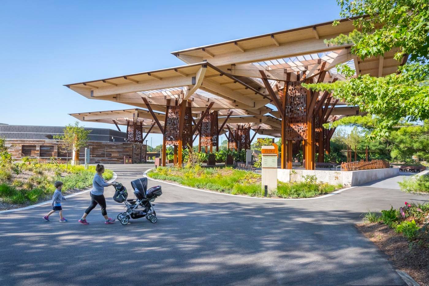 設(shè)計(jì)方案是創(chuàng)建一個(gè)露天的特殊活動(dòng)設(shè)施,以保護(hù)人們不受天氣影響,并能夠支持各種各樣的團(tuán)體活動(dòng)同時(shí)進(jìn)行,例如音樂(lè)會(huì)、野餐和私人活動(dòng)等。此外還有擴(kuò)大淡季影響一些活動(dòng),比如12月份的時(shí)候在動(dòng)物園內(nèi)舉辦圣誕活動(dòng)以及在10月份的時(shí)候舉辦的ZooBoo主題活動(dòng)(在本次項(xiàng)目之前,這種活動(dòng)主要通過(guò)在動(dòng)物園主入口靠近住宅后方的區(qū)域內(nèi)搭建半永久性的400人帳篷來(lái)進(jìn)行)。重要的是,這個(gè)新建的亭子必須具有足夠的吸引力,使其憑借子什么魅力變成一處景點(diǎn),同時(shí)還要足夠“安靜”以準(zhǔn)備好隨時(shí)轉(zhuǎn)變用途來(lái)舉辦活動(dòng)。
