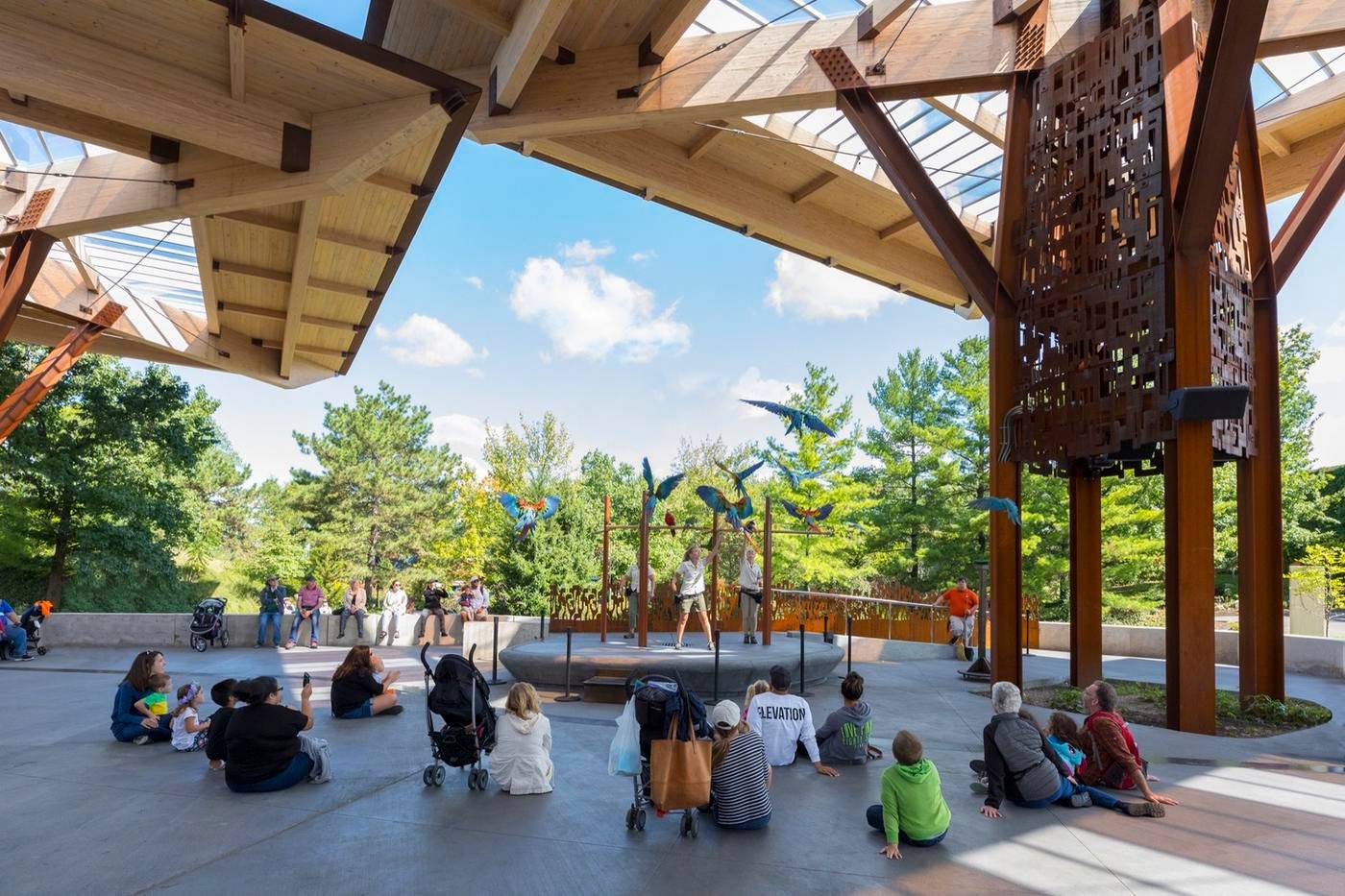 最終,森林般的環(huán)境為動(dòng)物園的最新鳥(niǎo)類(lèi)展覽形成了一處與眾不同的空間,美麗的金剛鸚鵡利用定制的舞臺(tái)和棲息處展示它們每天兩次飛越亭子的表演。