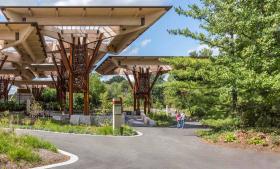 當(dāng)水落到亭子的屋頂上時(shí),便會(huì)順著漏斗的形狀進(jìn)入亭子內(nèi),滑到定制的、用激光切割制成的耐候鋼雨幕下方,再注入下沉的植物種植土壤中,經(jīng)過(guò)水質(zhì)過(guò)濾單元,最后流到一個(gè)14英尺大的由自由排水石構(gòu)成的沉淀池中,這套系統(tǒng)可以容納百年一遇的特大泄洪量。在每一個(gè)排水河床內(nèi)都有植物在飽和環(huán)境中茁壯成長(zhǎng),而故意伸出標(biāo)高平面的取水管道則是為了鼓勵(lì)土壤的自然滲透作用。