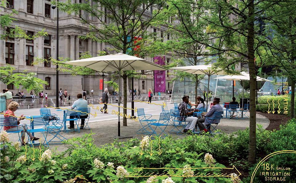 Dilworth Park at Philadelphia’s City Hall is a lively and contemporary embodiment of William Penn’s vision for Philadelphia as a ‘Green Country Town.’ Today the park is an inclusive hub of Philadelphia’s life outdoors but for decades this was not the case. Prior to renovation Dilworth was an uninviting and inaccessible maze of raised and sunken terraces, hidden passageways, and defunct fountains surrounded by gloomy malnourished trees. The opportunity for change raised the park, both physically and metaphorically, to the prominence of its location at the foot of Philadelphia’s City Hall. The new park provides universal accessibility by bringing the entire site to street level, and encourages use throughout the day with a variety of programming. The entire park, with its generous lawn, interactive fountain, café, and ample seating amidst green groves of native plantings, are all built atop the nexus of Philadelphia’s multi-modal transit system and acts as a connective gateway to all of Philly’s neighborhoods. The park functions as a 2.5-acre green roof, creating a welcome all-season spot for relaxation and public recreation.