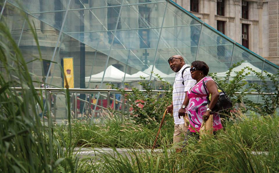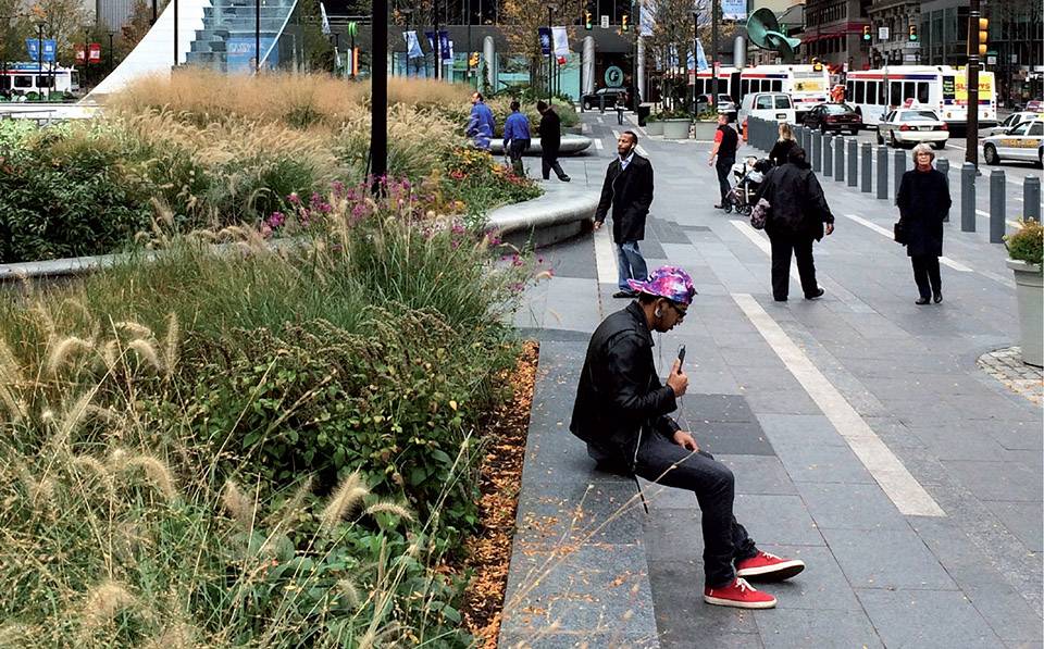 After restoring the entire site to street level, the design team incorporated a variety of spaces: transit gateways, a café, a lawn, and a flexible plaza animated by a dynamic scrim fountain. Elegant plantings of trees and shrubs frame the activity and help buffer street noise. To foster year-round interest, the team selected plantings reflective of the native plant communities of the Mid-Atlantic ecoregion: sweetspire and viburnums with their early blooms in April and May, summer blooms of mountain laurel and false spirea, and autumnal golds and reds of locust and maple trees, oakleaf hydrangeas, and red twig dogwood stems. During winter the panicum and purple love grass hold their structure in dormancy. To reduce runoff and meet Philadelphia’s stringent green infrastructure requirements, rainwater is captured and diverted to a stormwater catchment and filtration system integrated throughout the park. Along with the planted areas, the stormwater system of the park has reduced the amount of impervious surface area by 38%.