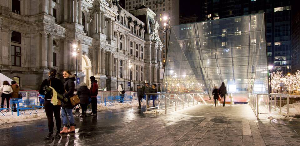 The fountain was purposely scaled to encompass the largest portion of the site. During commuting hours, the panels of jets, all flush with the rest of the site, bubble gently to delineate circulation through the park, mask traffic noise and reflect the surrounding architecture. The team choreographed a more energetic display to take place during the day. Working with an artist the team integrated an illuminated ribbon within the fountain evoking the industrial history of Philadelphia in an engaging display of mist which is particularly evocative in the evenings. This engaging multi-sensory display has become a popular summertime attraction for families with young children, who delight in chasing the dancing jets. For events, the fountain can be quickly drained to accommodate both small and large crowds. In the winter, the fountain transforms into an ice skating rink, and the café offers skate rentals and warm beverages. Ice skating at Dilworth Park is now one of the most popular seasonal activities in the city.