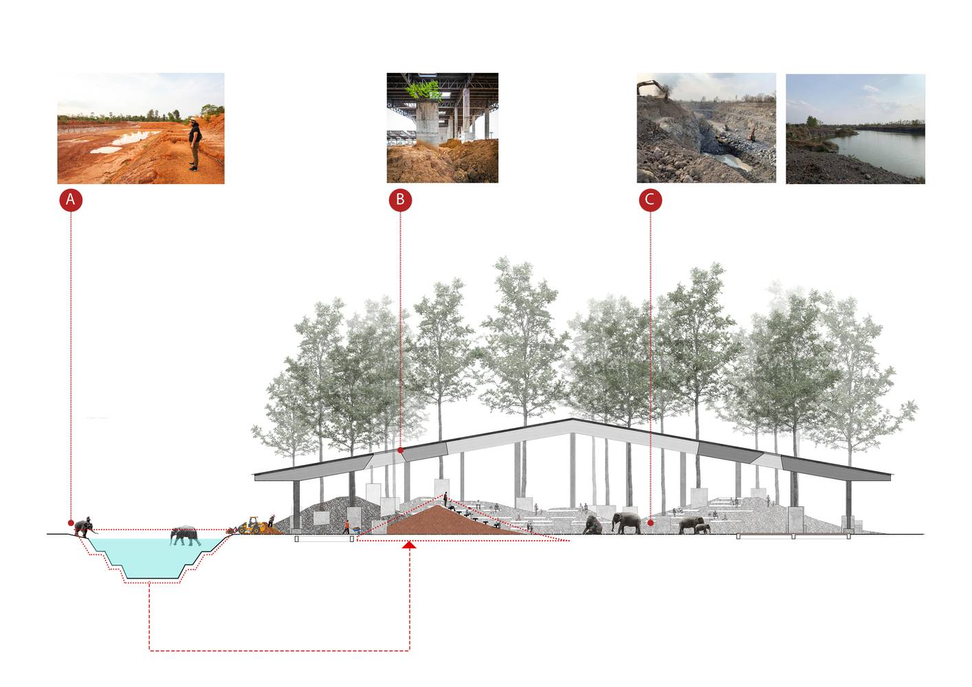 項目基地距離河流大約有4公里的距離,但考慮到200只大象們的巨大耗水量,建筑師還設(shè)計了一個雨水收集池,以應(yīng)對這一挑戰(zhàn)。而收集池的建設(shè),也剛好使得8500立方米的土壤可以用于土墩的建造,從而形成一個類似于圓形劇場的庭院空間。