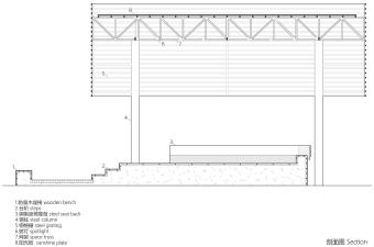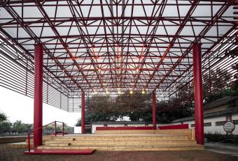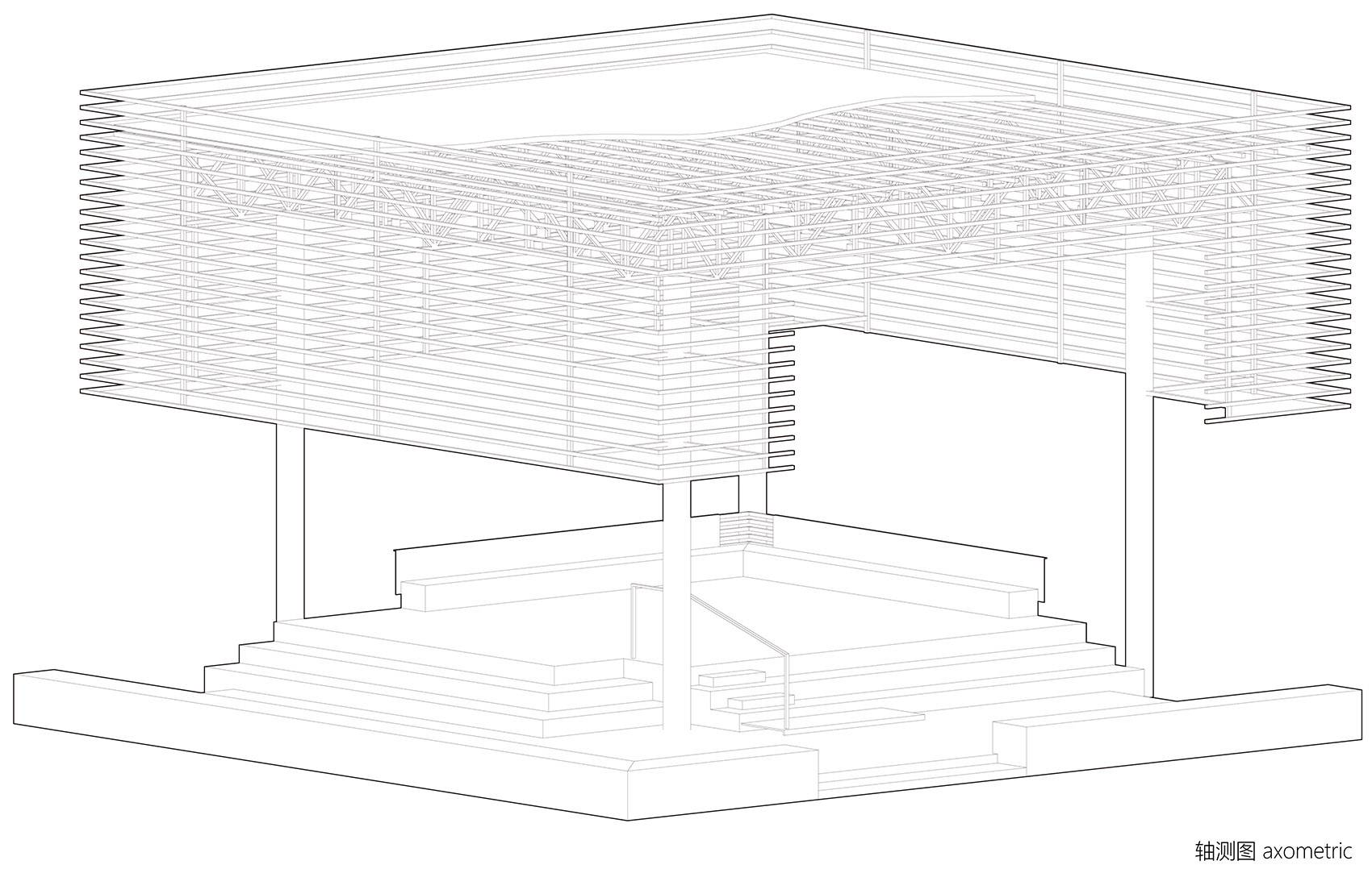 The site is located at one end of the village square, with building walls on both sides of the northwest, whereas square and roads on the southeast. Due to the obstruction of the existing buildings, the idea that the stage should be open on all sides became difficult to realize. Therefore, the two sides facing the walls are lifted upward and then turned into seats, while the other two sides extend outward, forming a small audience area. The whole floor plane of the stage and the roof form a set of two malposed squares, one large and one small, forming a special staggered spatial relationship.
