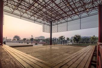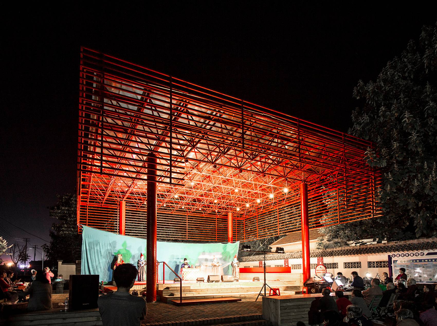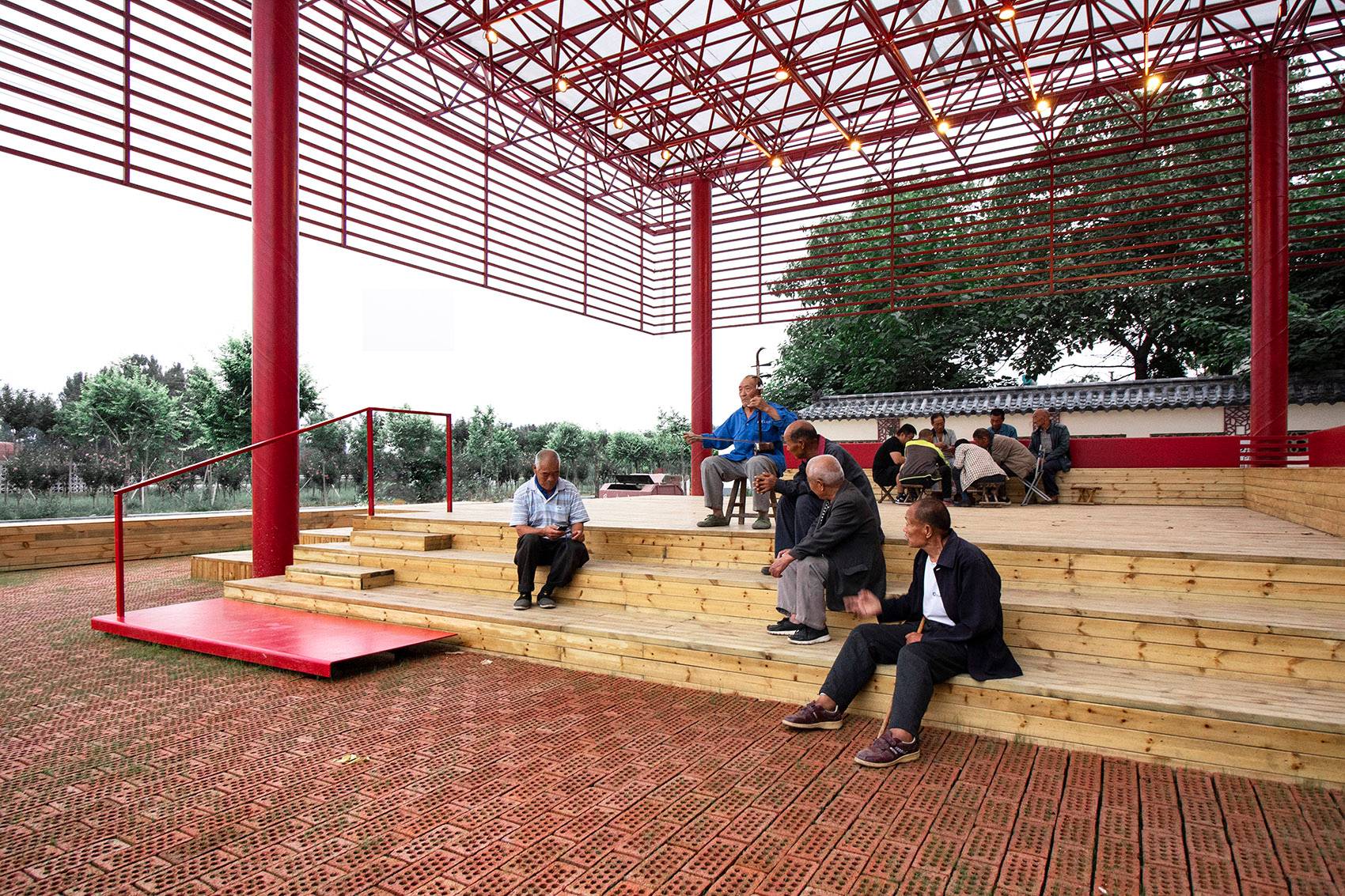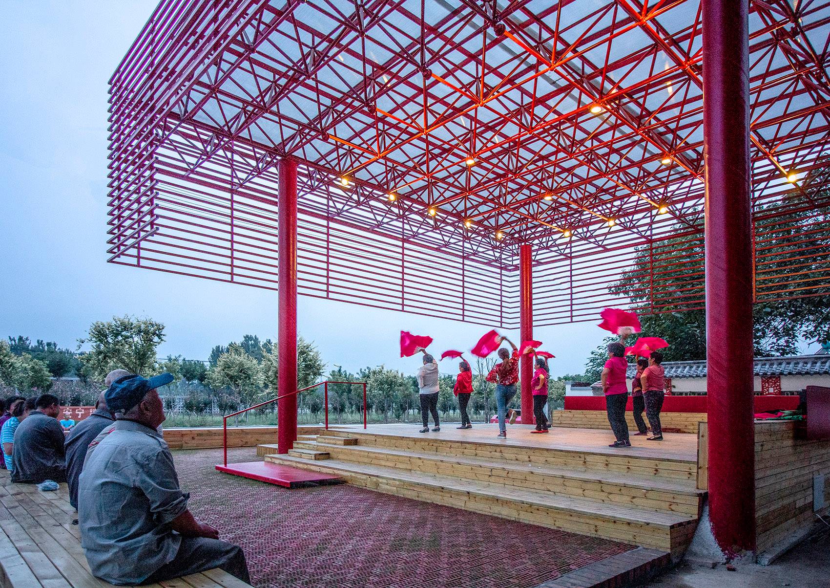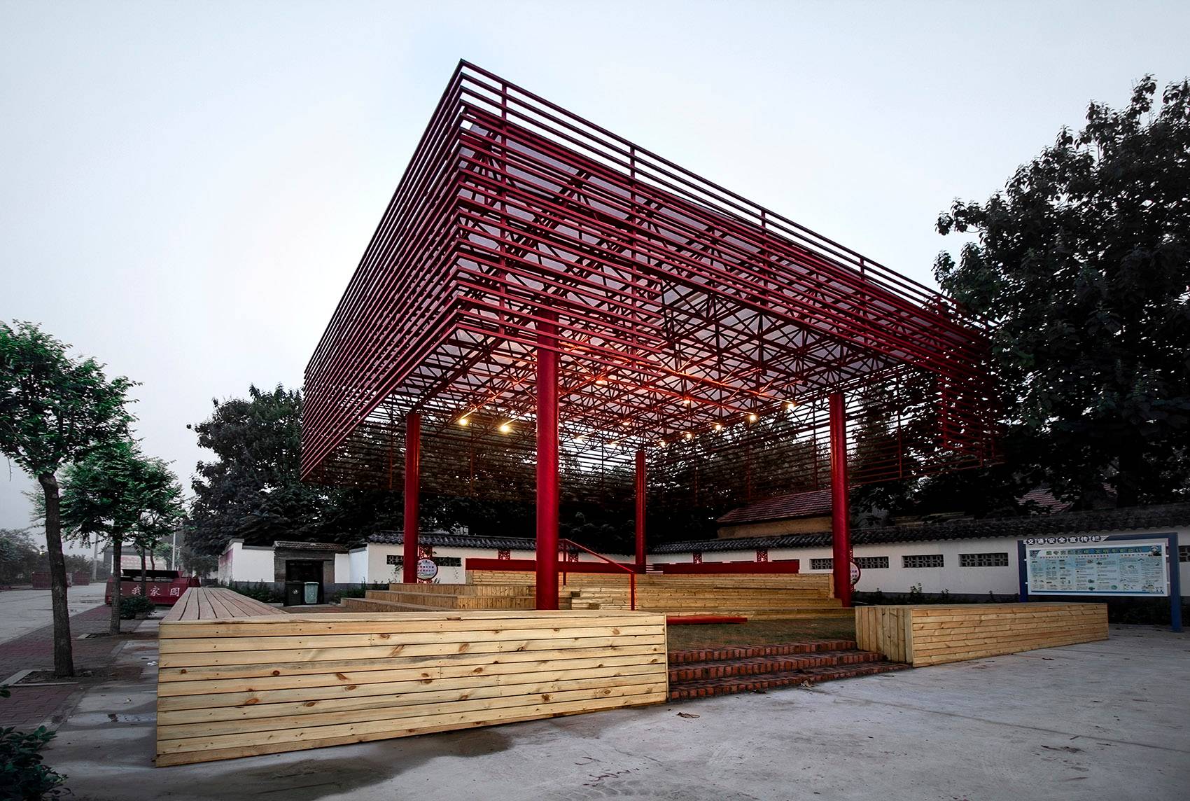 Red is a favored color in Chinese countryside. The whole roof structure is sprayed with festive red, like a red lantern, which becomes a landmark installation in the village. The Plaza where the stage located is also a place for the rural market. When markets are held, colorful stalls and bustling crowds form a fantastic and mutually contrasting picture of rural life under the huge floating red canopy. At the same time, the red canopy and its multi-functional basement space also accommodate part of the market stalls, integrating the stage with the rural fairs.